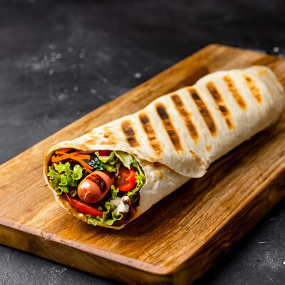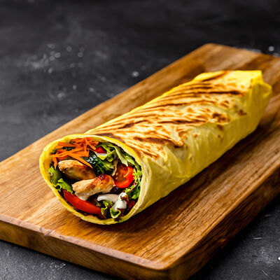 Лаваш сырный, куриное филе, морковь по-корейски, капуста, помидоры, огурцы, чесночный соус, кетчуп, соль