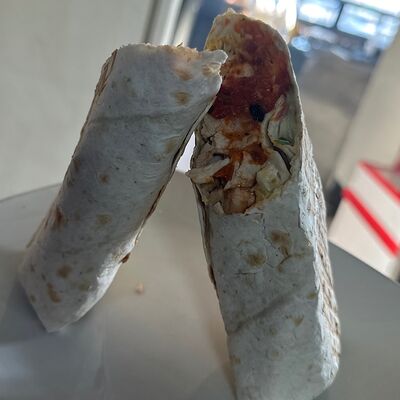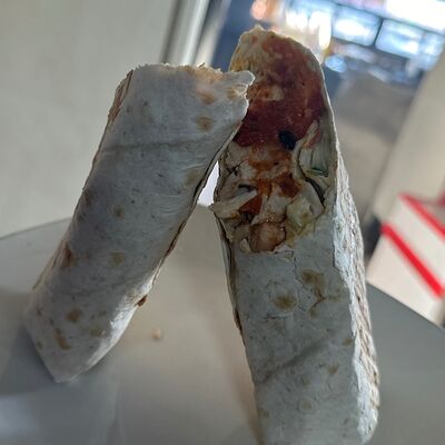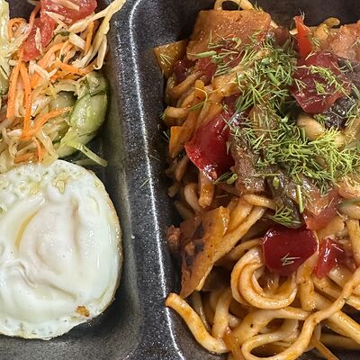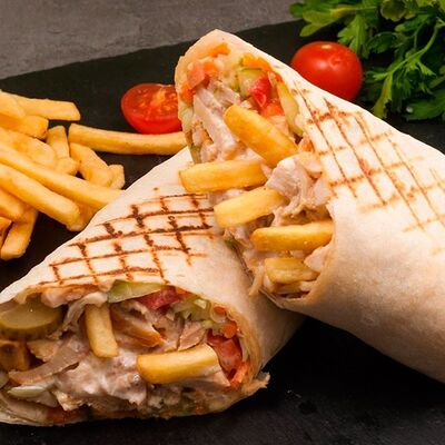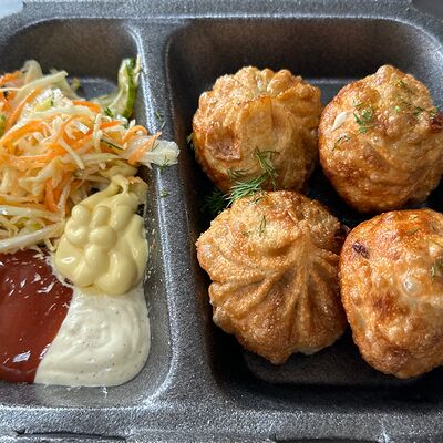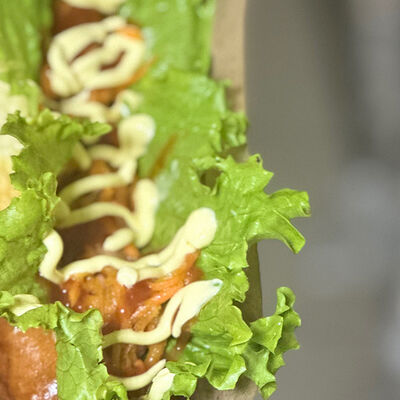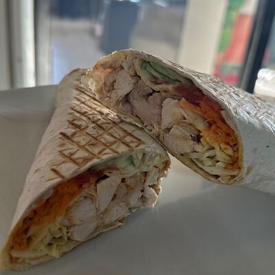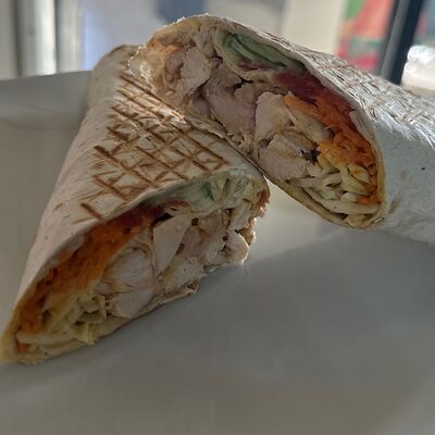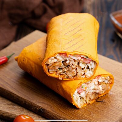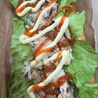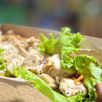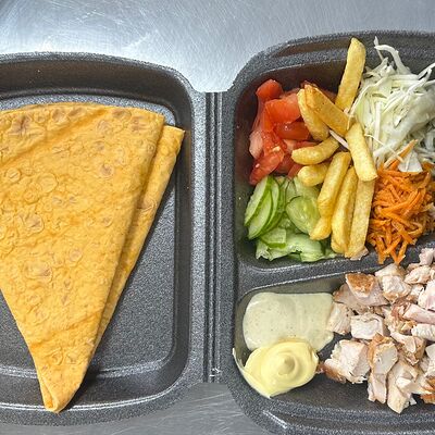 Куриное филе, обжаренное на мангале, помидоры черри, огурцы свежие, капуста белокочанная, морковка корейская, кетчуп, чесночный соус