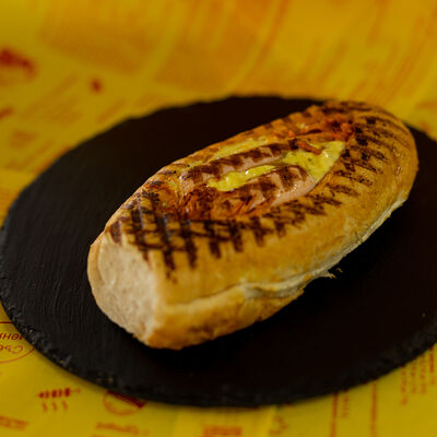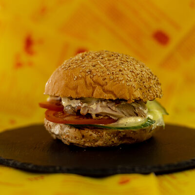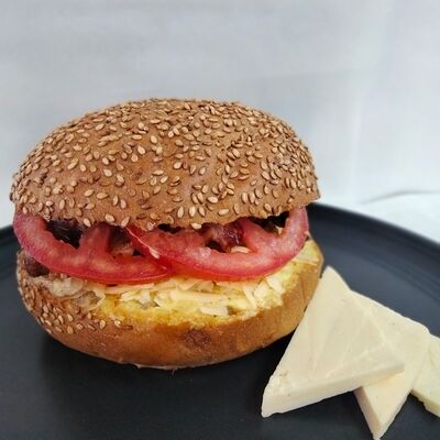 Булочка с кунжутом, сырный соус, сыр, свежий помидор, маринованное куриное мясо
