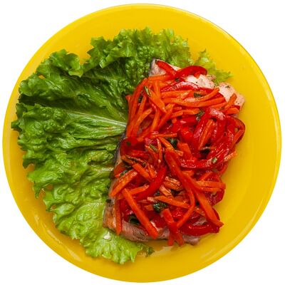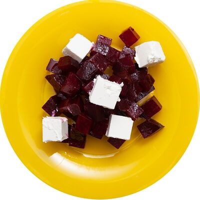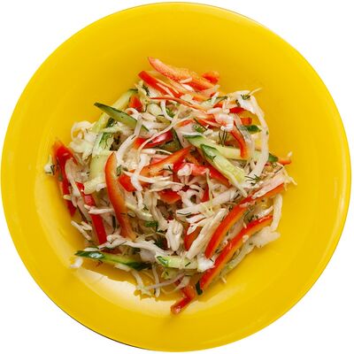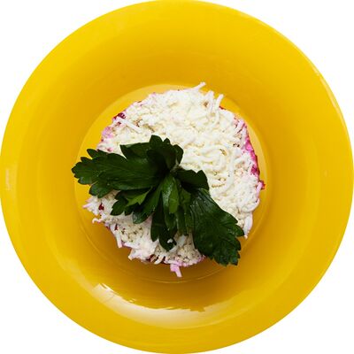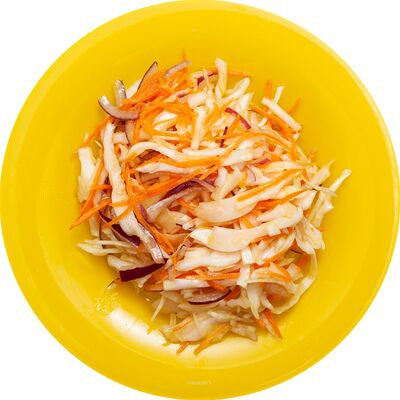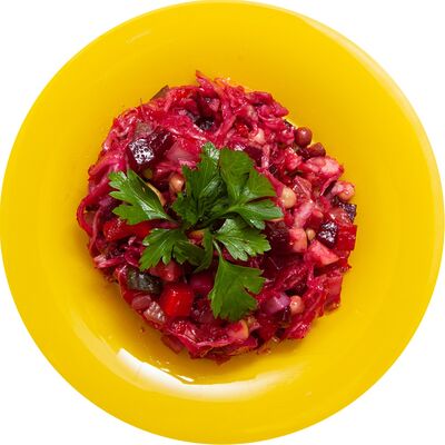 Свекла отварная, огурцы маринованные, морковь отварная, лук репчатый, картофель отварной, капуста маринованная, горошек зеленый, соус винегрет