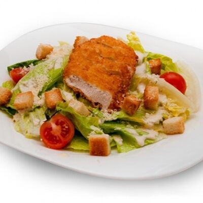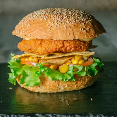 Куриное филе в хрустящей панировке, помидоры, кукурузные чипсы начос с паприкой, сладкая кукуруза, лист салата, сырный соус