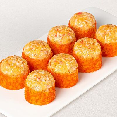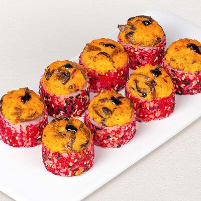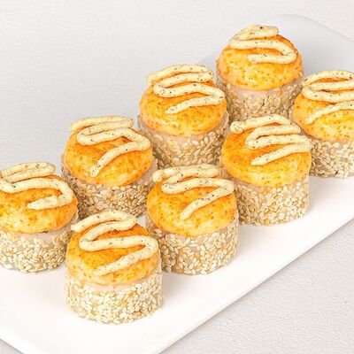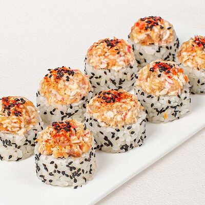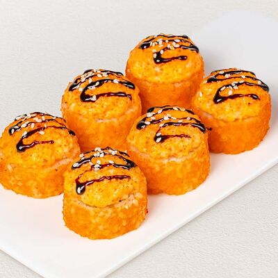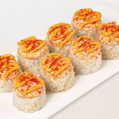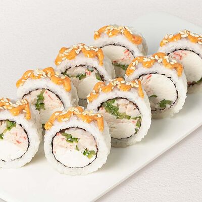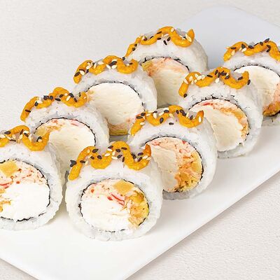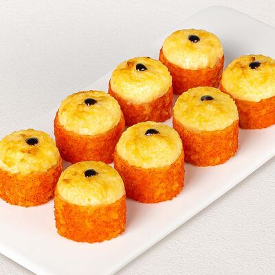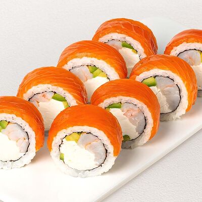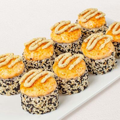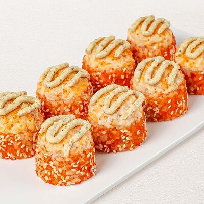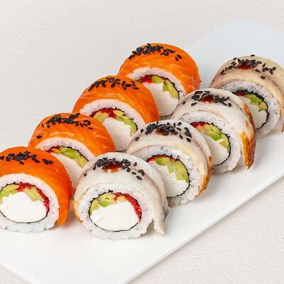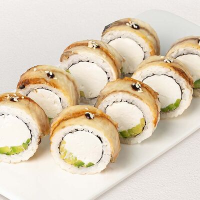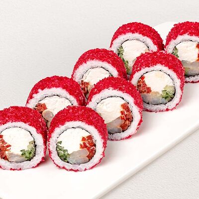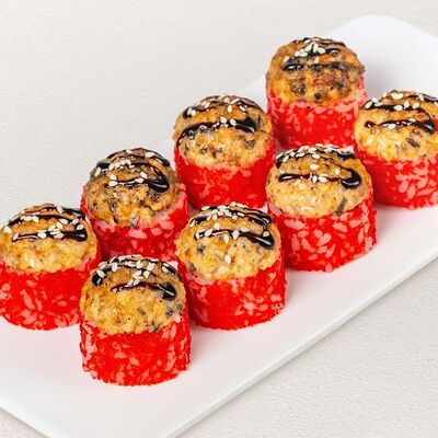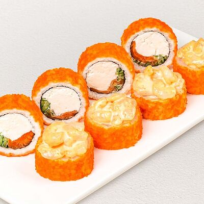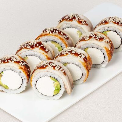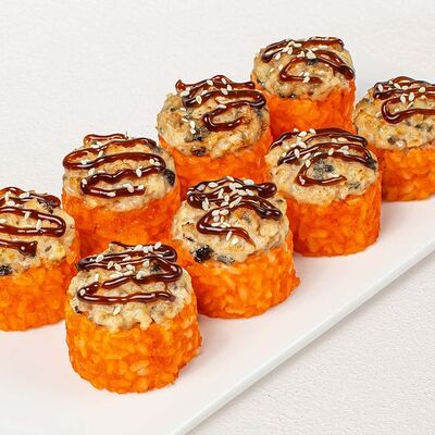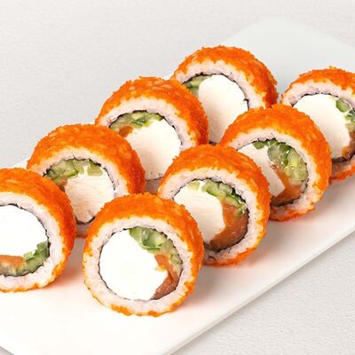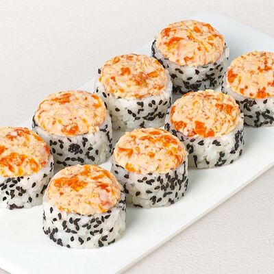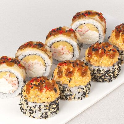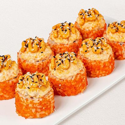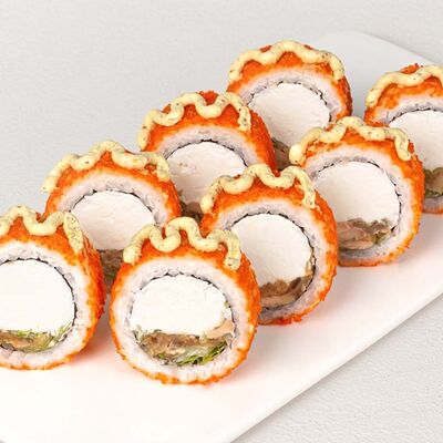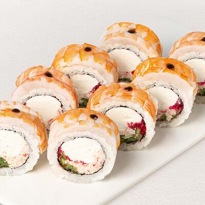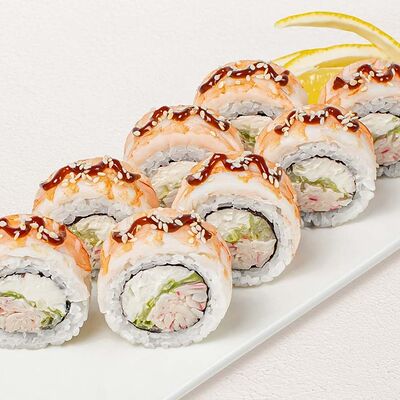 Креветки, сыр сливочный, яки соус, кунжут, унаги соус, масаго