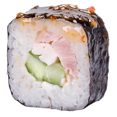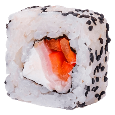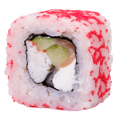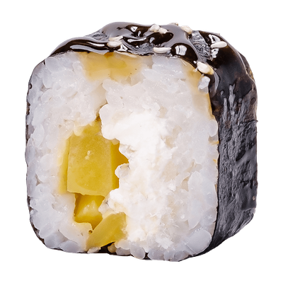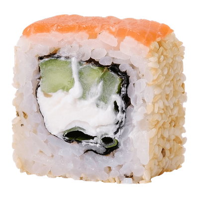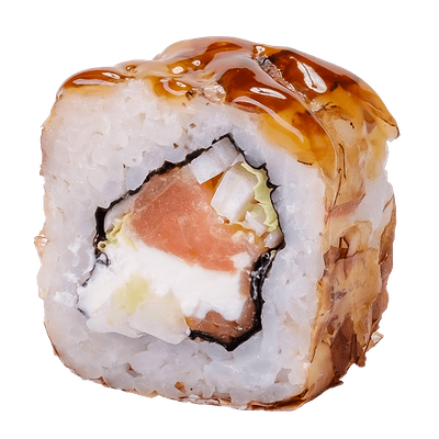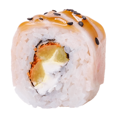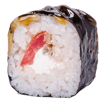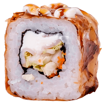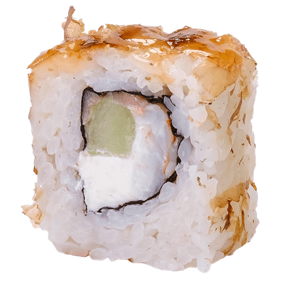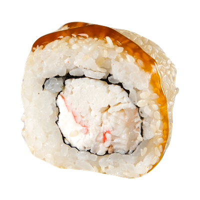 Рис, нори, сыр сливочный, краб, угорь, кунжут белый, соус Терияки