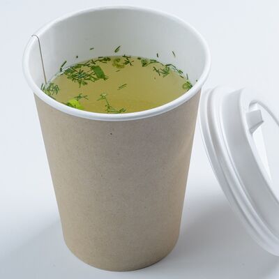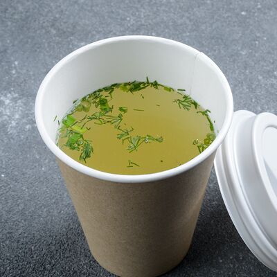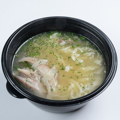 Бульон куриный, лапша домашняя, курица, зелень, лук