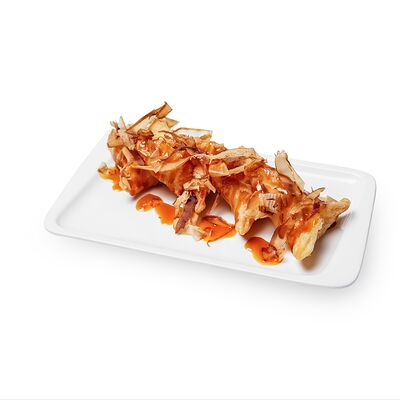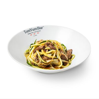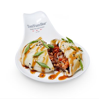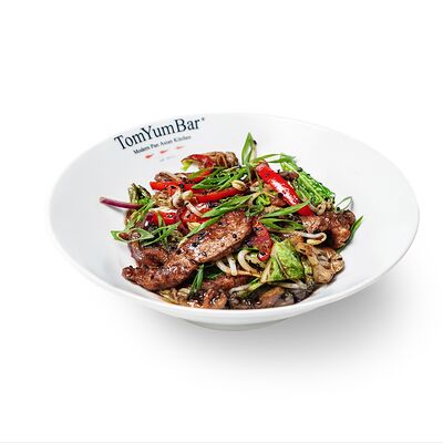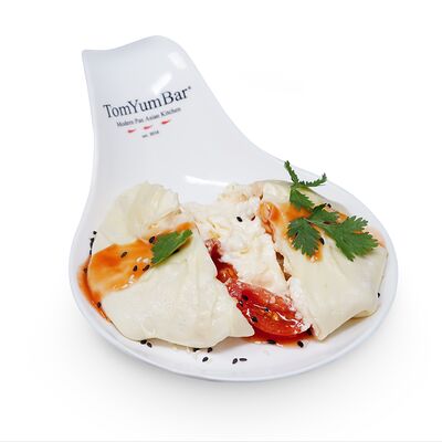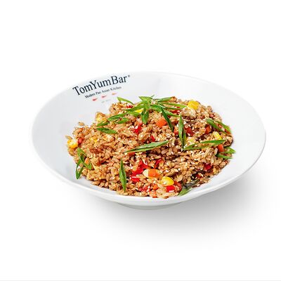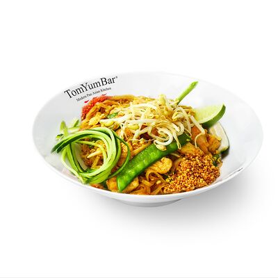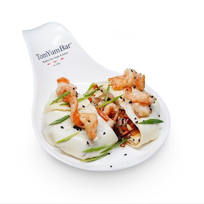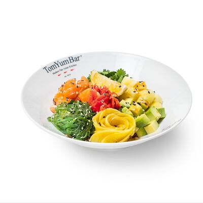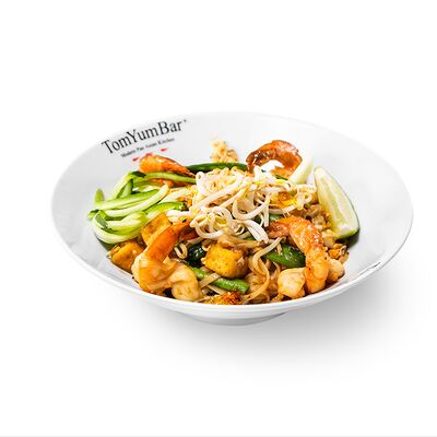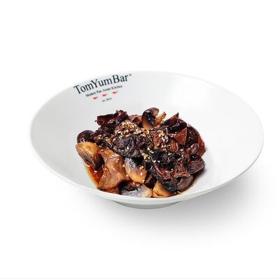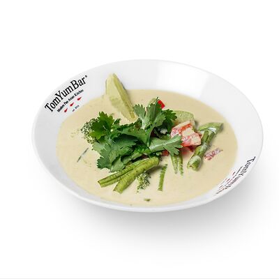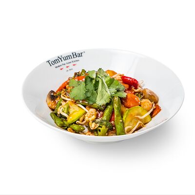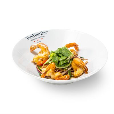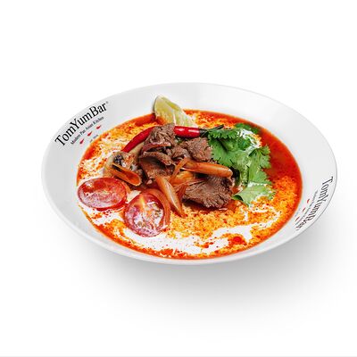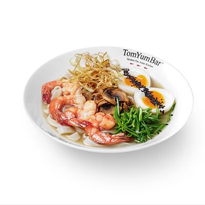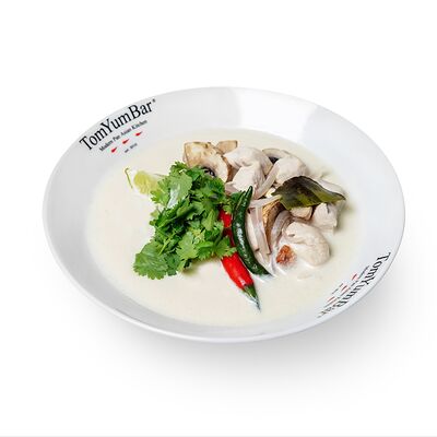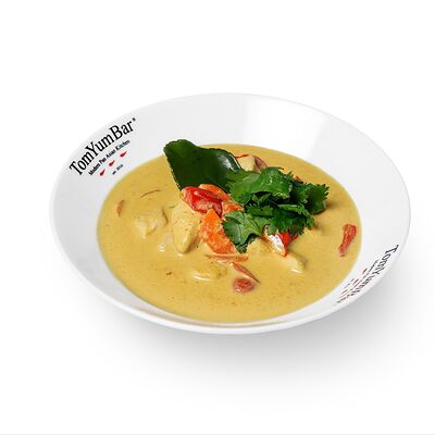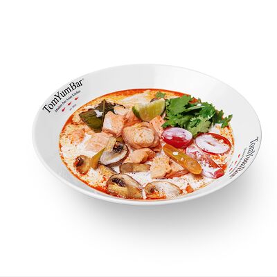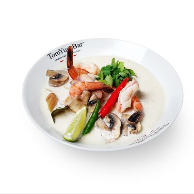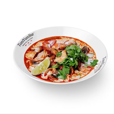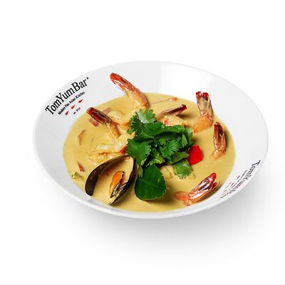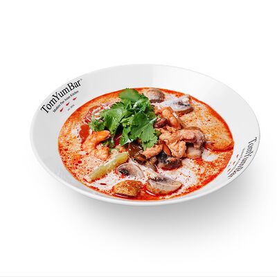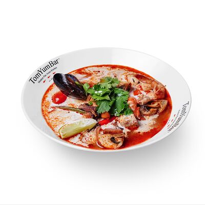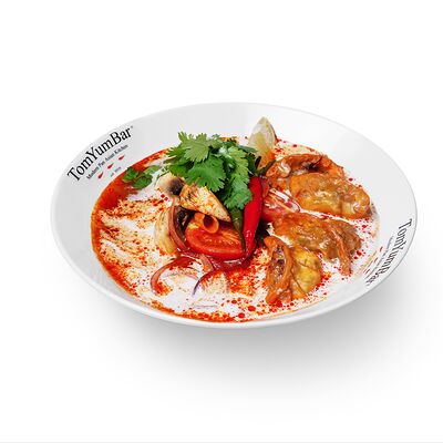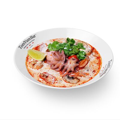 Кальмары, щупальца осьминога, мясо мидий, королевская мидия в створке, королевские креветки, помидоры черри, лук-шалот и шампиньоны, лайм, кинза, кокосовое молоко. Подается с порцией пропаренного риса. Традиционный тайский суп на основе куриного бульона с добавлением острой пасты tom yum, оригинальных трав, специй и пряностей Таиланда