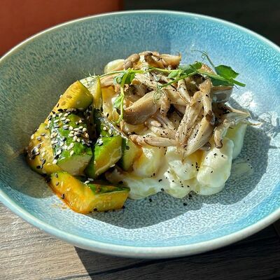 Обжаренный во фритюре батат, подается с соусом ореховый кимчи