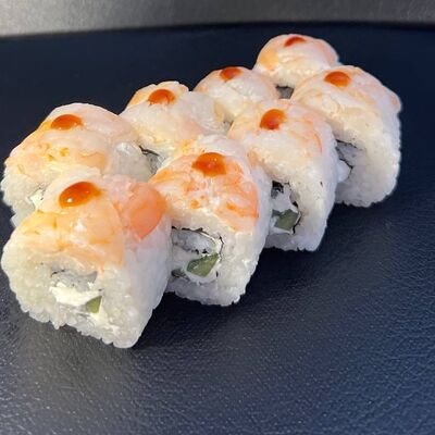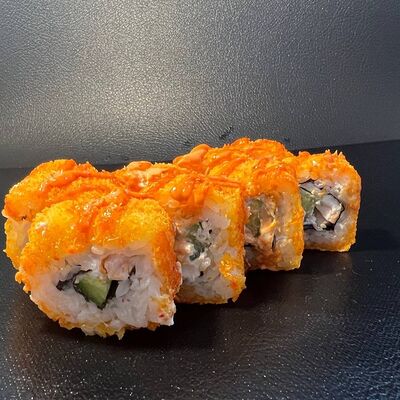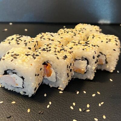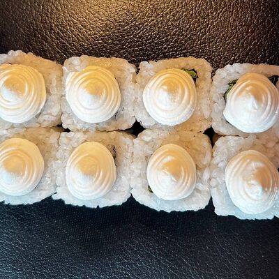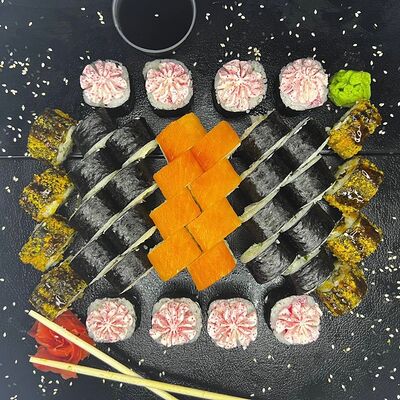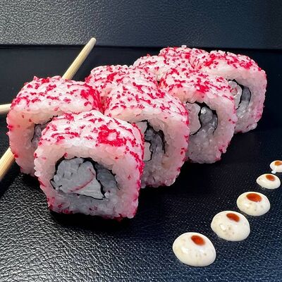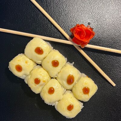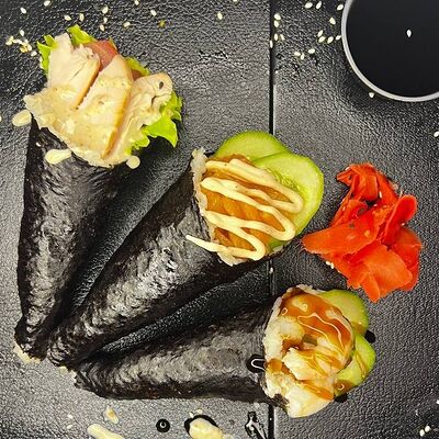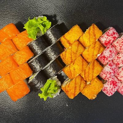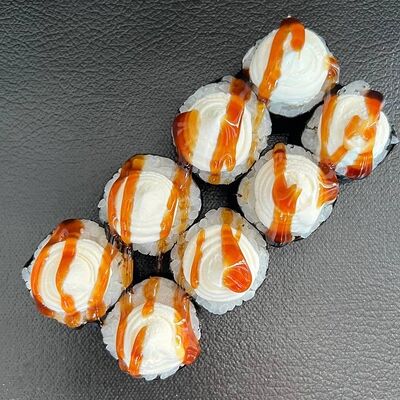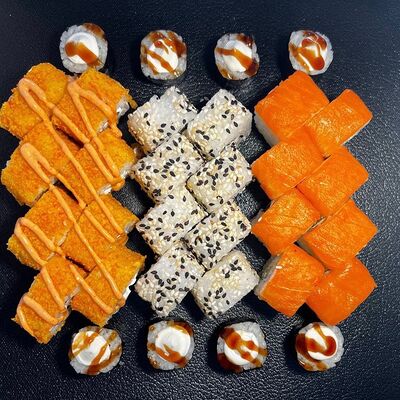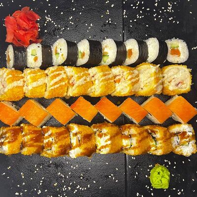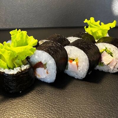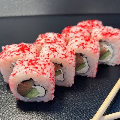 Рис, нори, лист салата, творожный сыр, лосось, соус спайси, соус ореховый