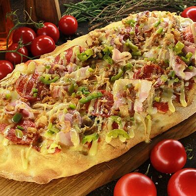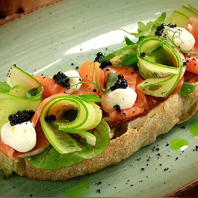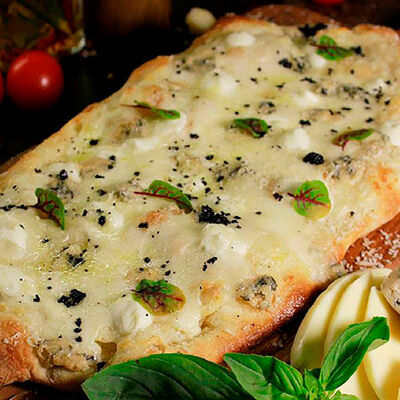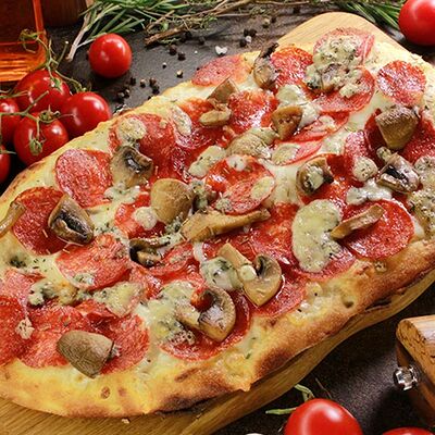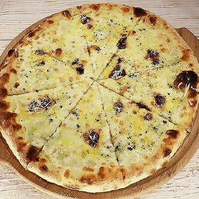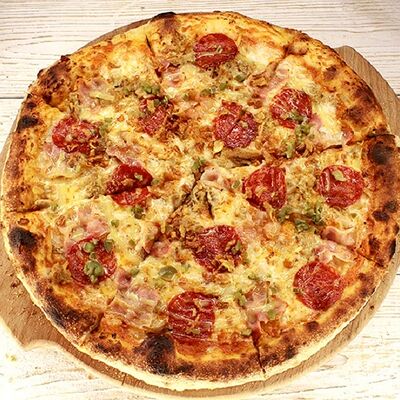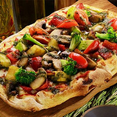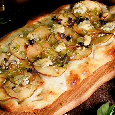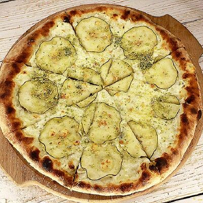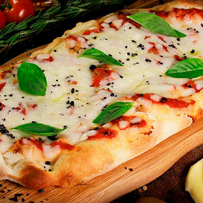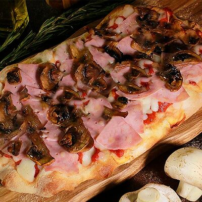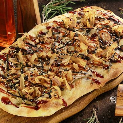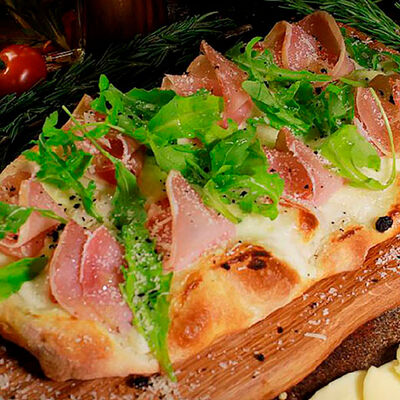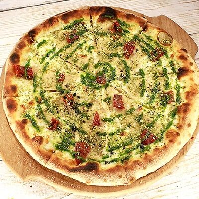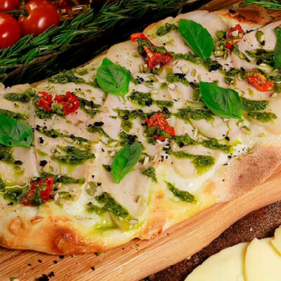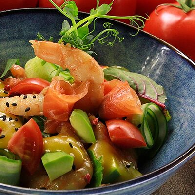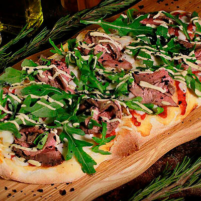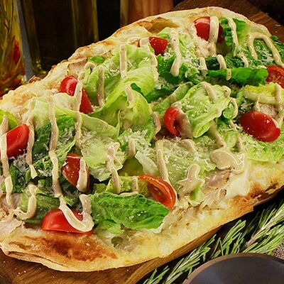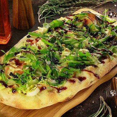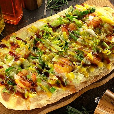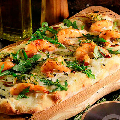 Мука, дрожжи, масло оливковое, сыр творожный, сливки, сыр моцарелла, креветки, соус устричный, руккола, огурец свежий, соус чили