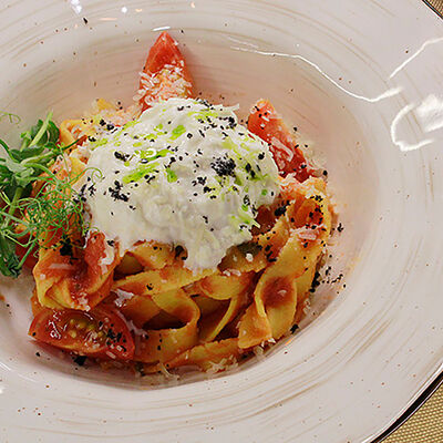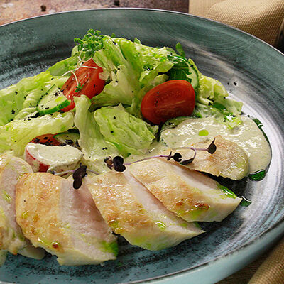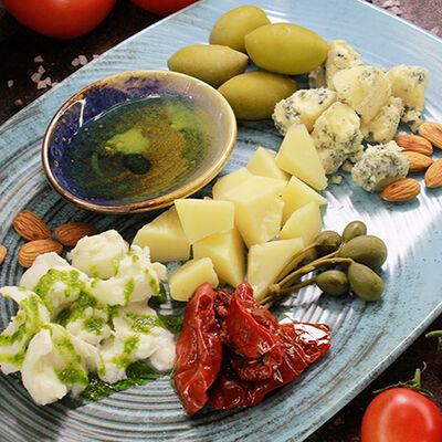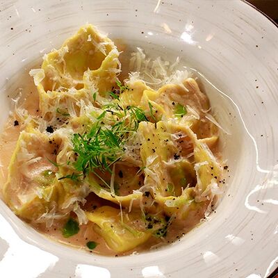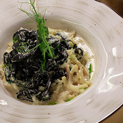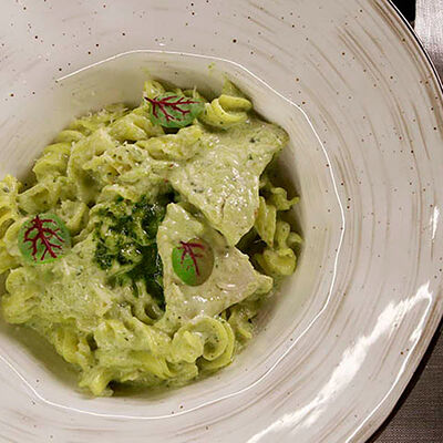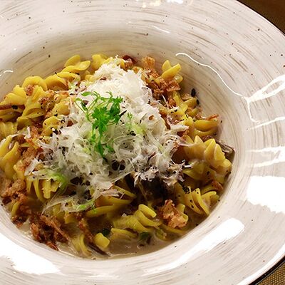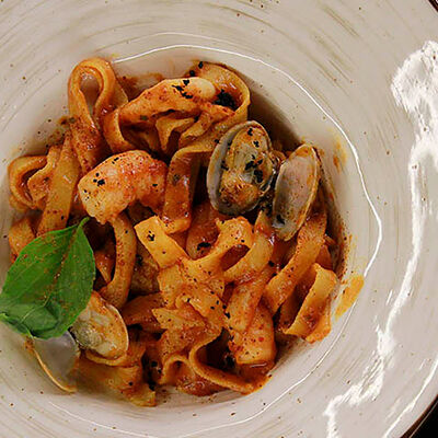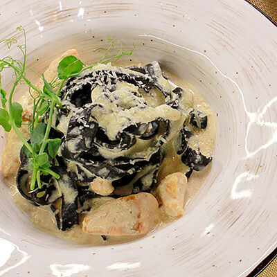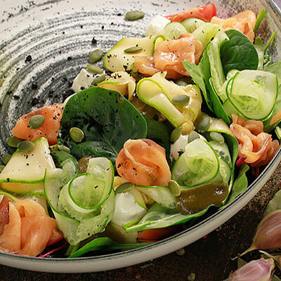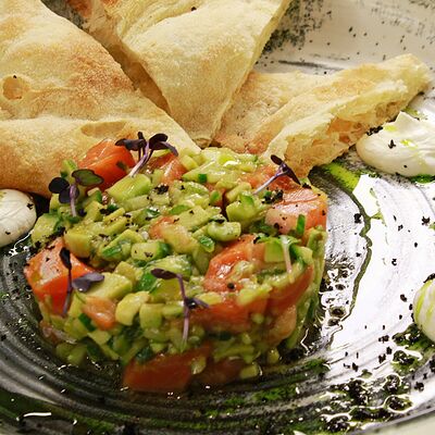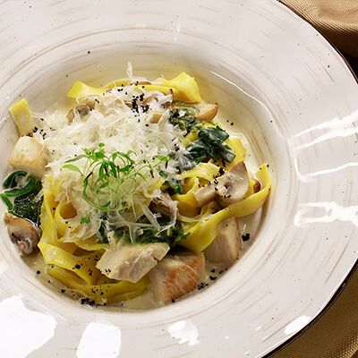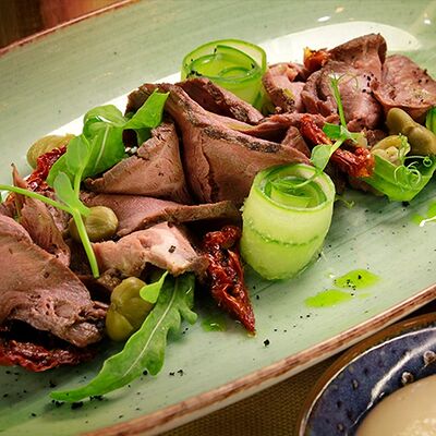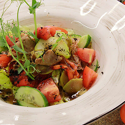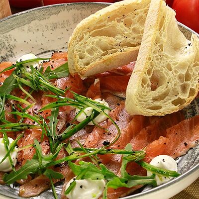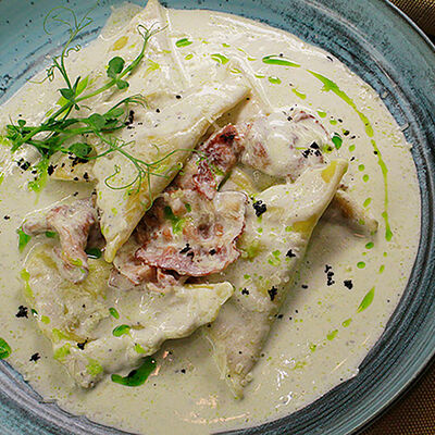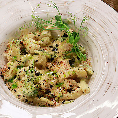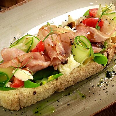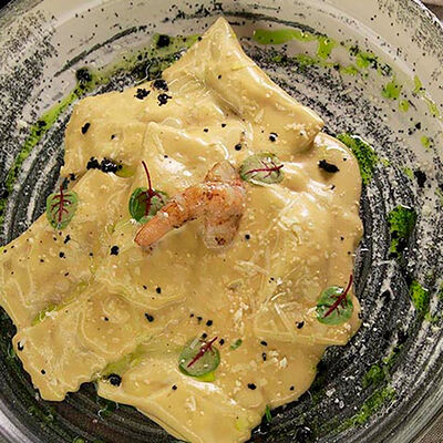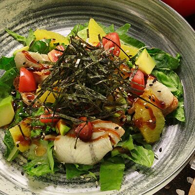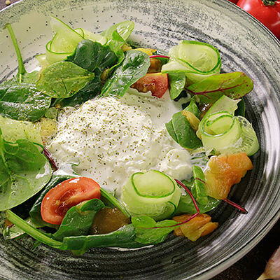 Мука, дрожжи, масло оливковое, сыр творожный, сливки, сыр моцарелла, креветки, соус устричный, руккола, огурец свежий, соус чили