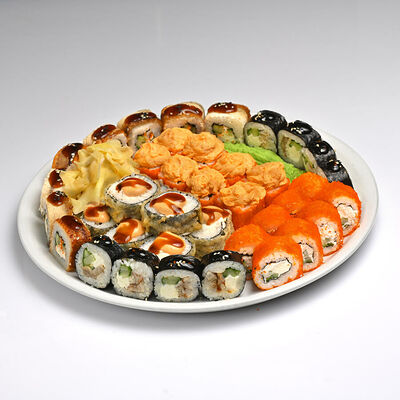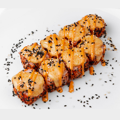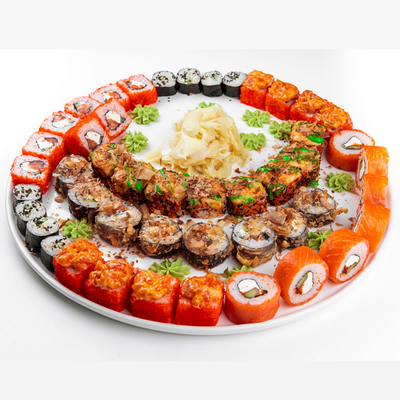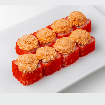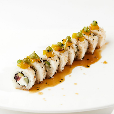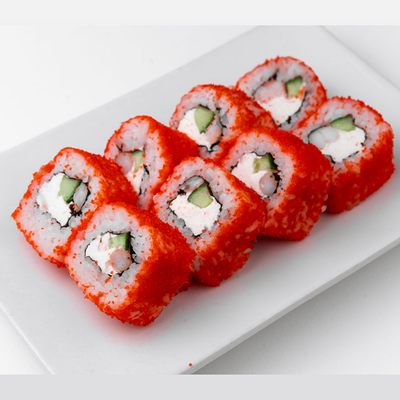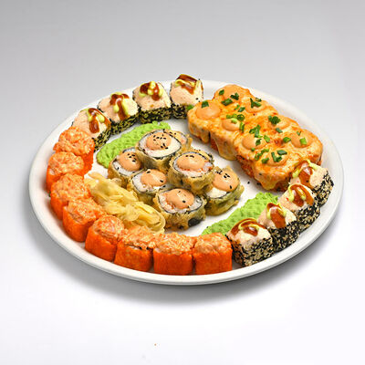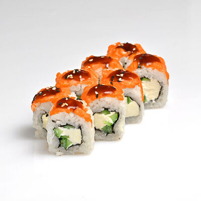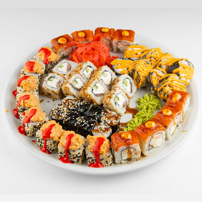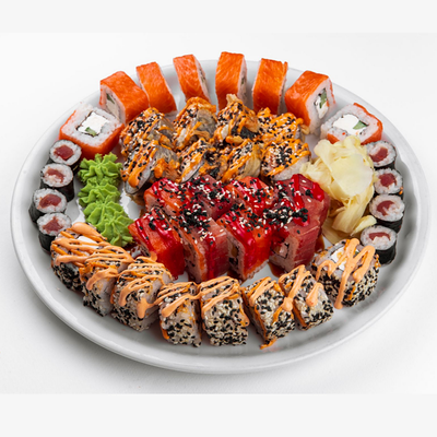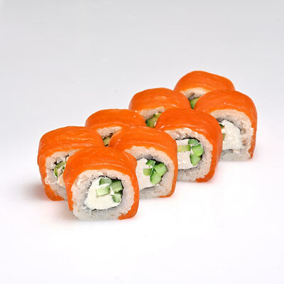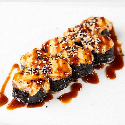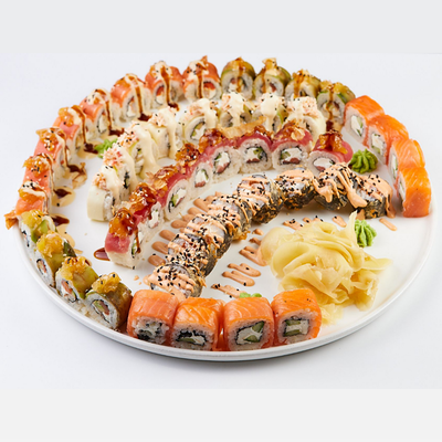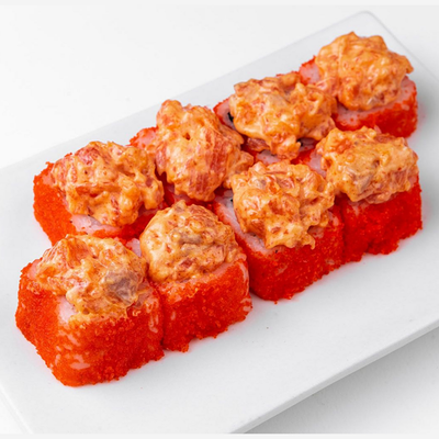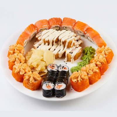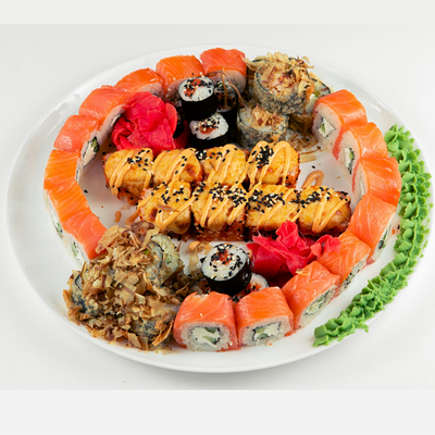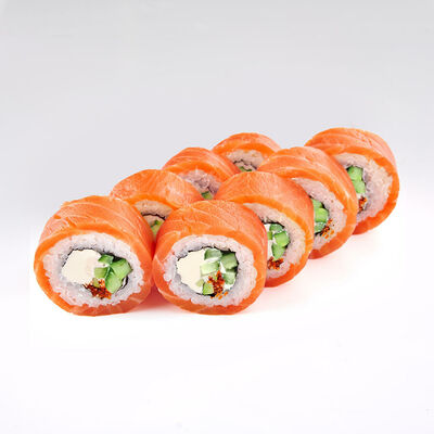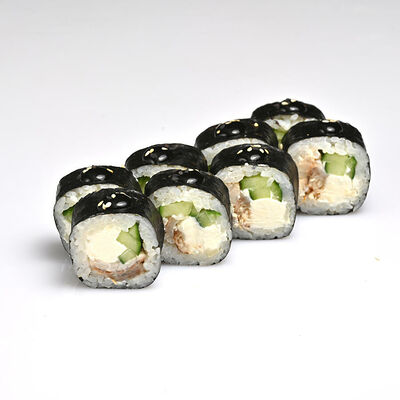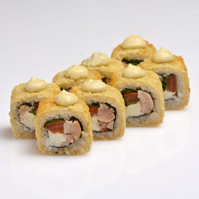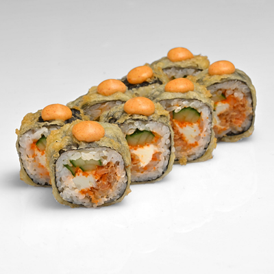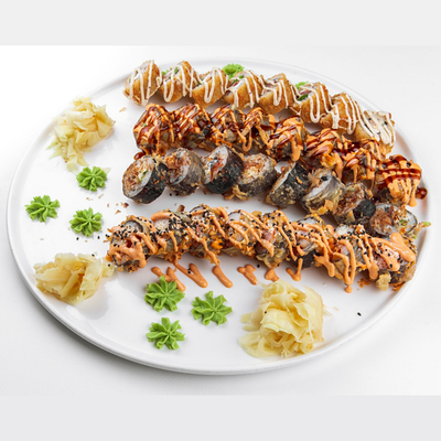 Филадельфия, Сакана, Копченый цыпленок с соусом спайси, Темпура с тигровой креветкой и соусом спайси, Ролл с тунцом