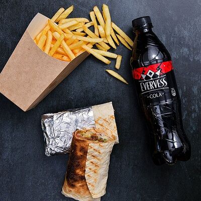Шаурма болоньезе, картофель фри, кола