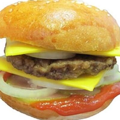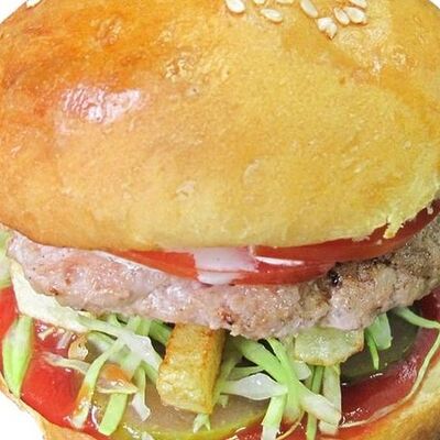 Булка с кунжутом, бифштекс из говядины, помидоры свежие, огурцы маринованные, картофель фри, салат, кетчуп, майонез