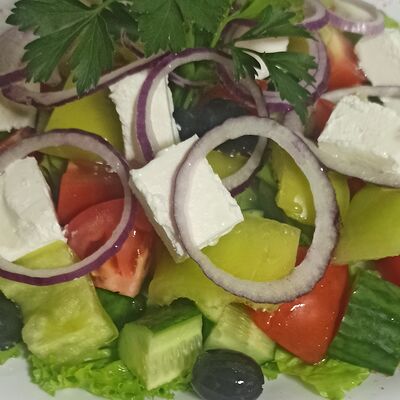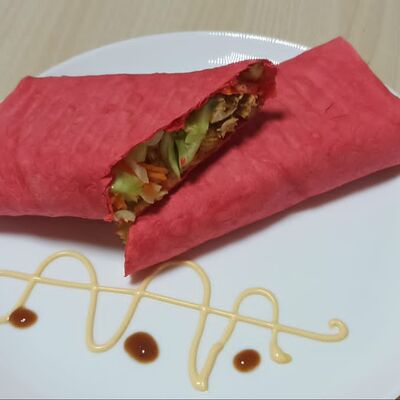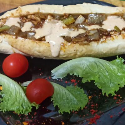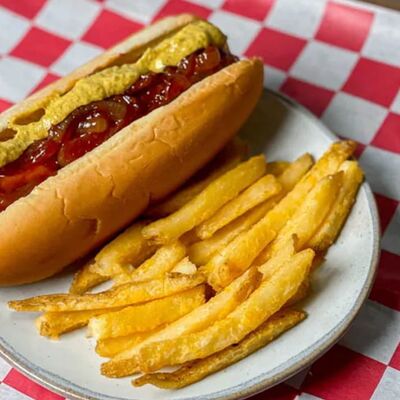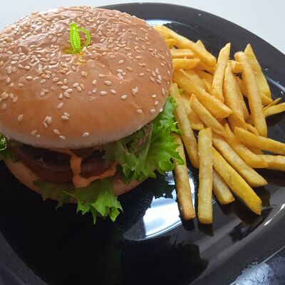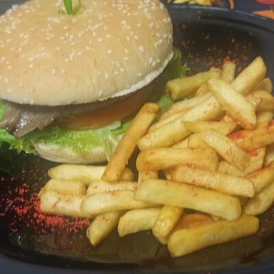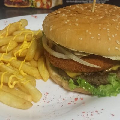 Говяжья катлета, салат, лук, помидор, ананас, солёный огурец, фирменный соус. Картошка фри в комплекте