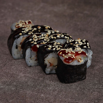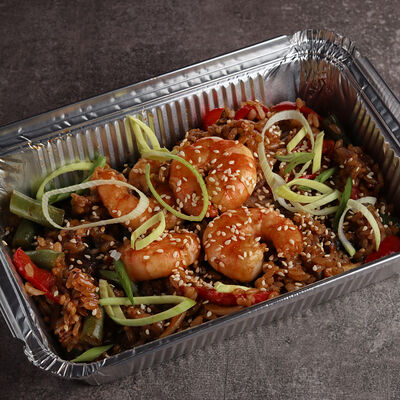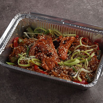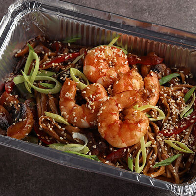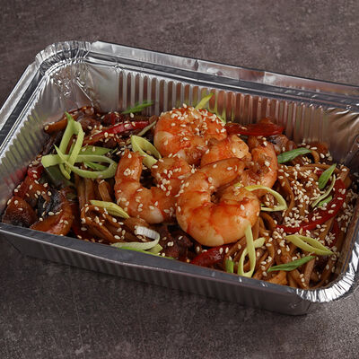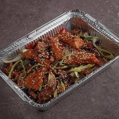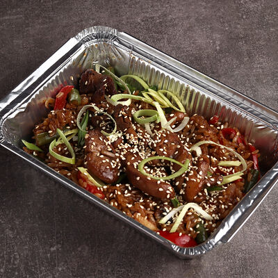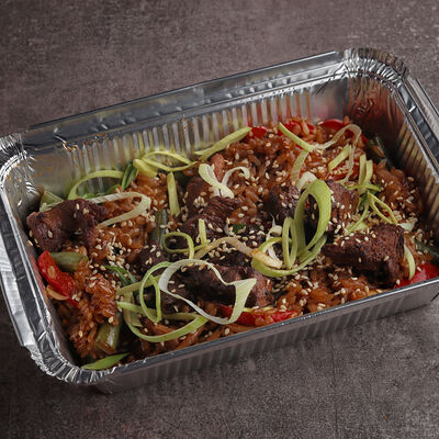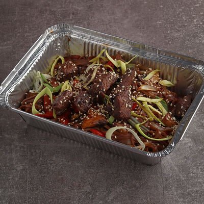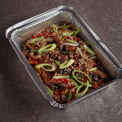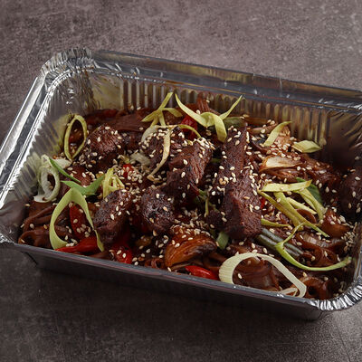 Говядина, лук репчатый, перец болгарский, фасоль, грибы шампиньоны, удон, чеснок, имбирь, кунжут, лук-порей, соус фирменный, бульон бонито