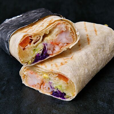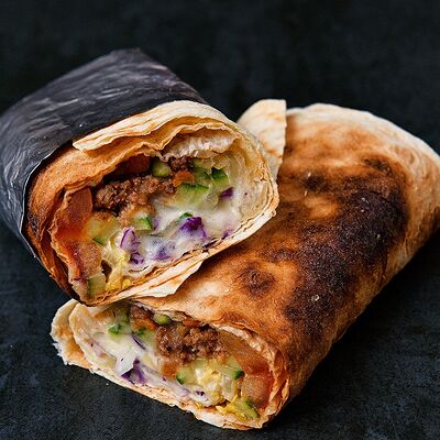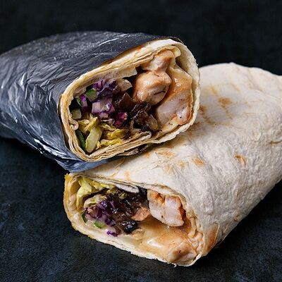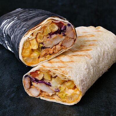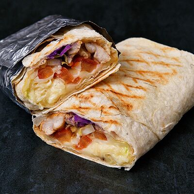 Лаваш, микс-салат, соус крем-гратен (картофель, сливочный сыр, специи, бульон), сыр моцарелла, курица, лук репчатый, помидор
