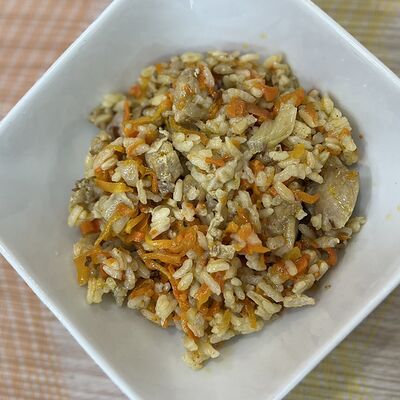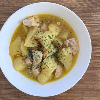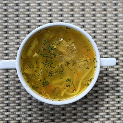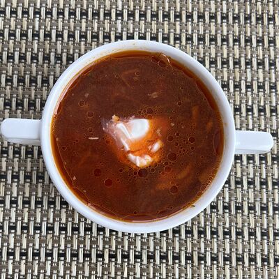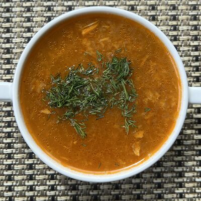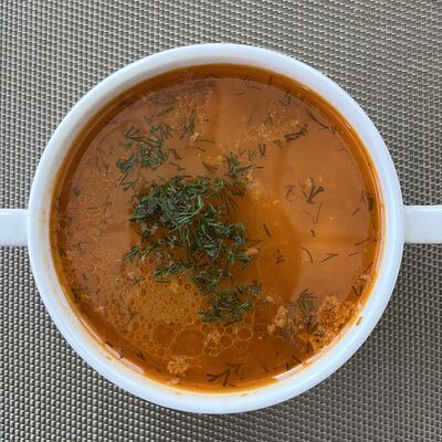 Бульон куриный, картофель, морковь, лук, капуста, крупа перловая, томатная паста, огурцы соленые
