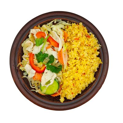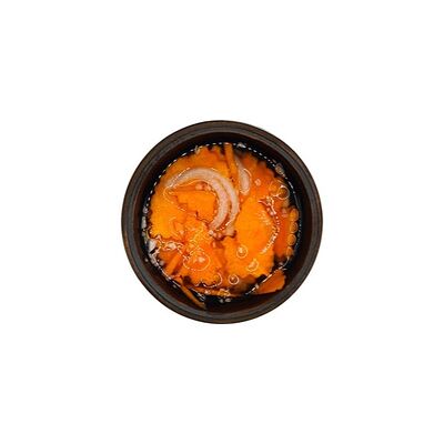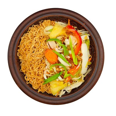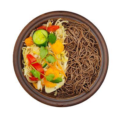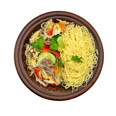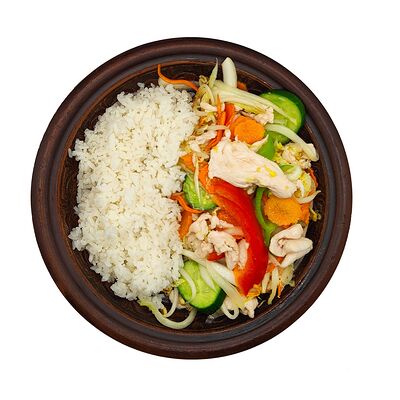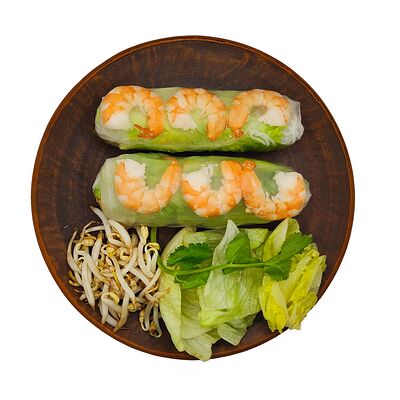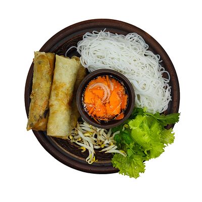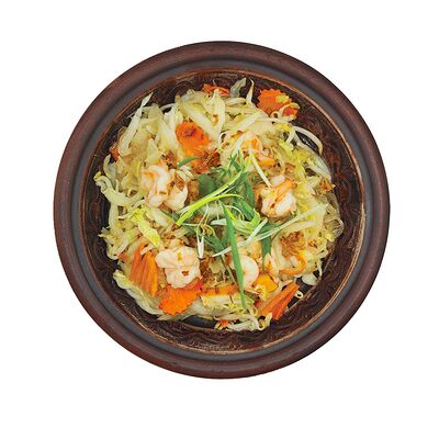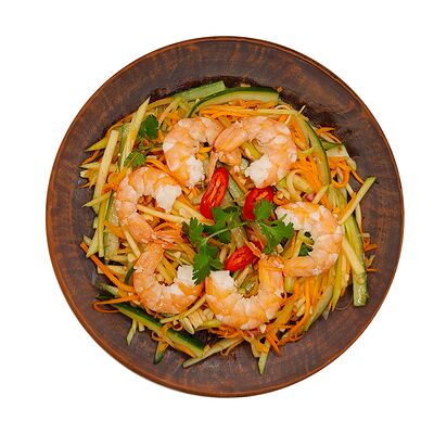 Манго, морковь, огурец, кинза, кисло-сладкий соус, арахис, креветки или грудка куриная