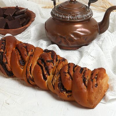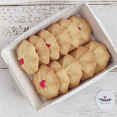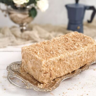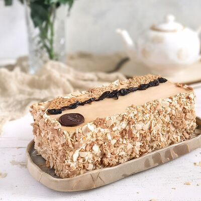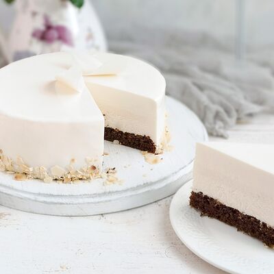Нежный шифоновый бисквит прослоённый манговый курдом и чиз кремом. Облит гляссажем и декорирован воздушным рисом в белом шоколаде