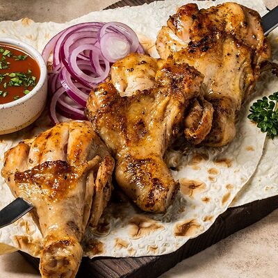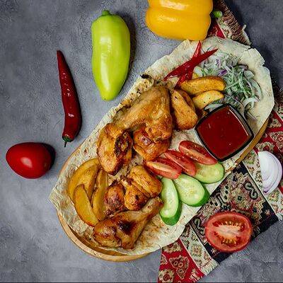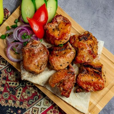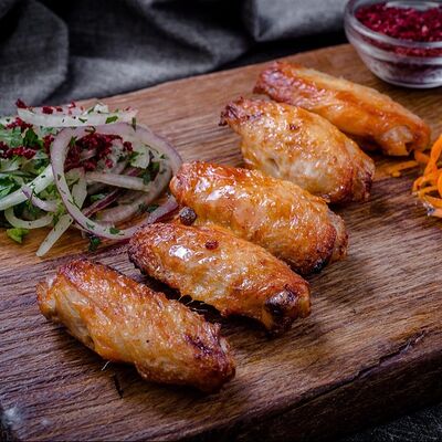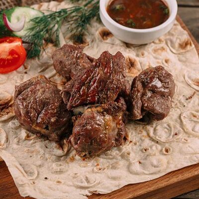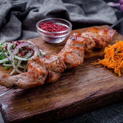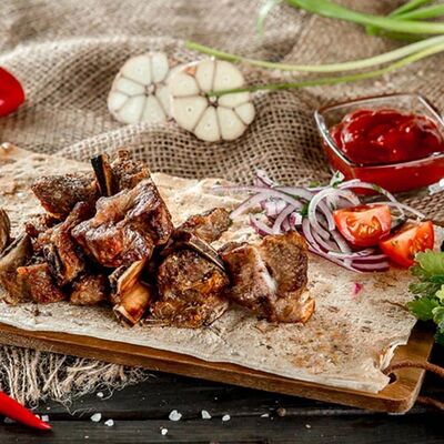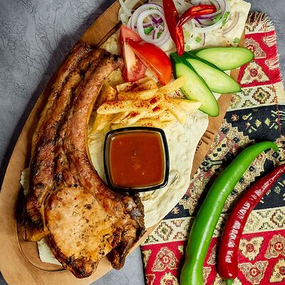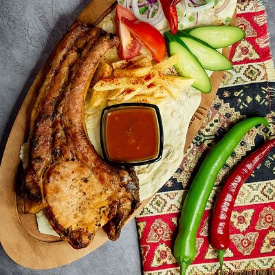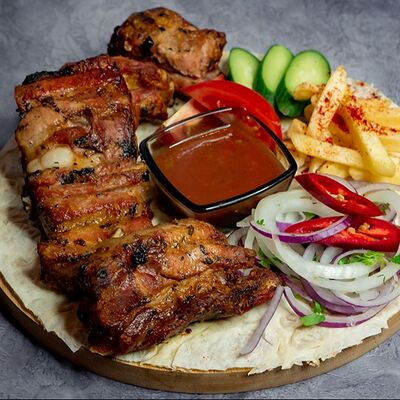 Ароматные свиные ребрышки на мангале в дуэте со специями. Классическая американская закуска к пенному. Подается на лаваше с соусом, маринованным луком, салатом из капусты и моркови
