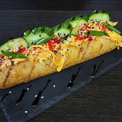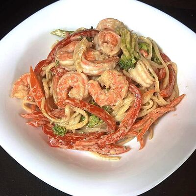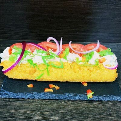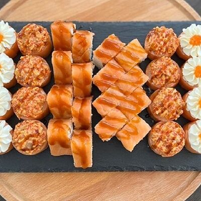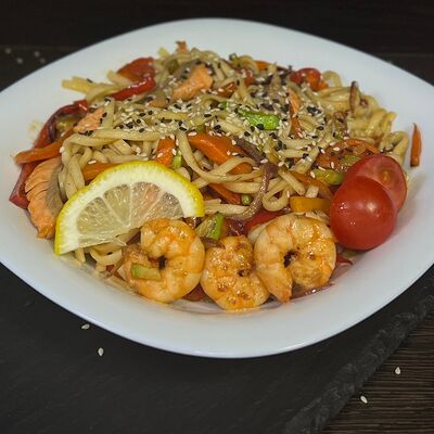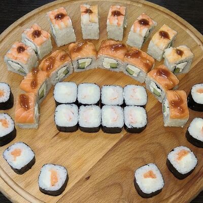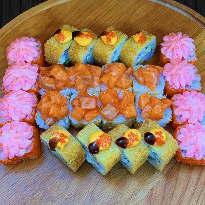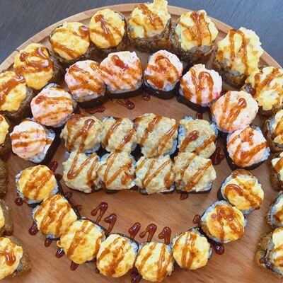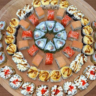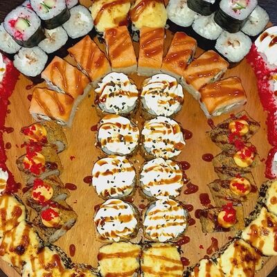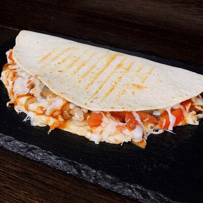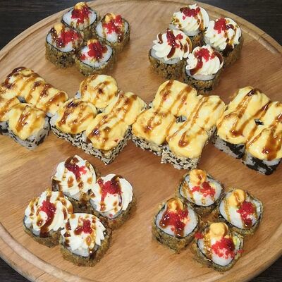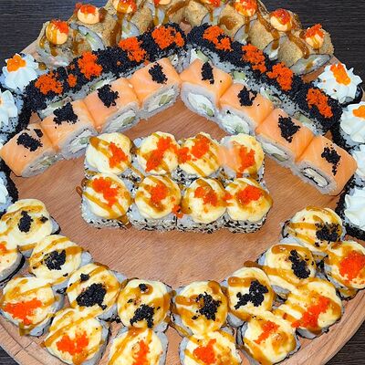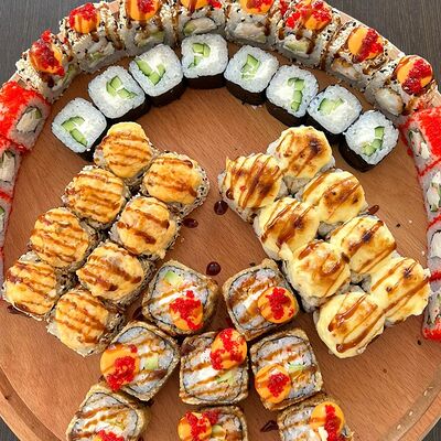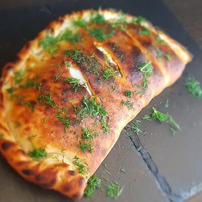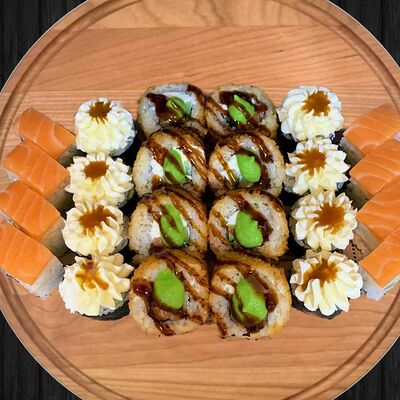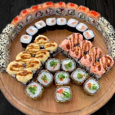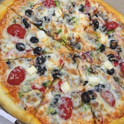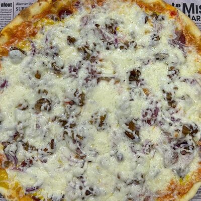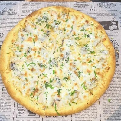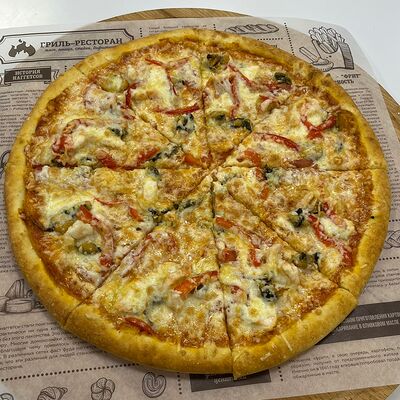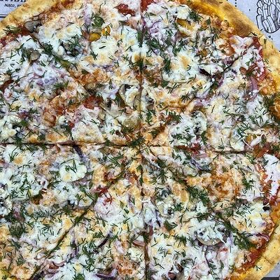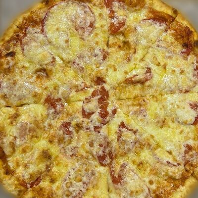 Тесто, соус, моцарелла, ветчина, шампиньоны, помидоры (36 см)