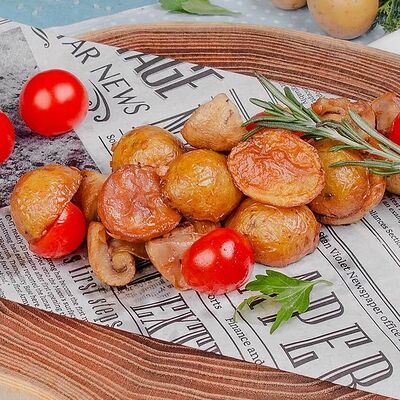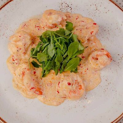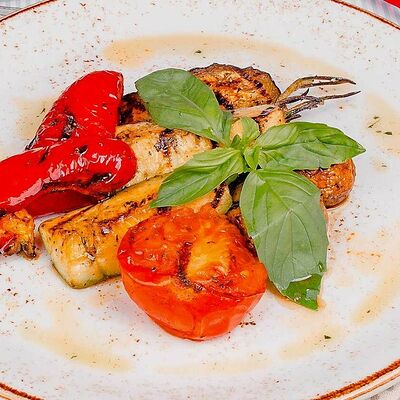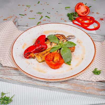 Куриное филе, грибы шампиньоны, цукини, помидор, соус томатный, чеснок, специи, сливки, лук (30 см)