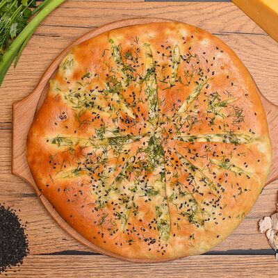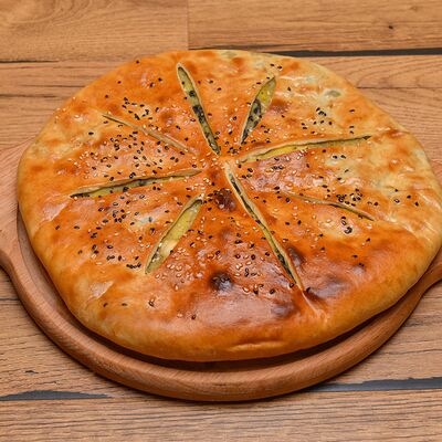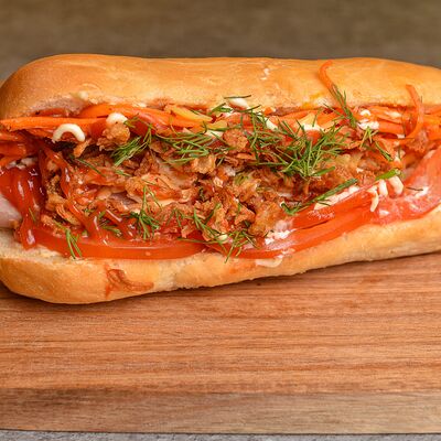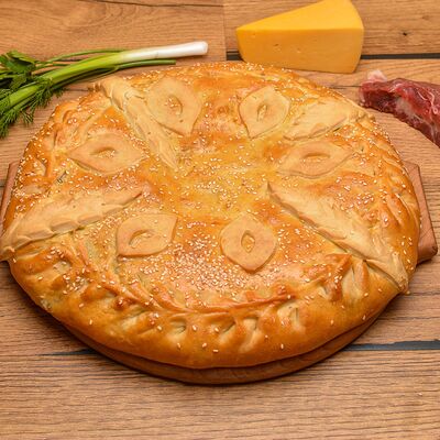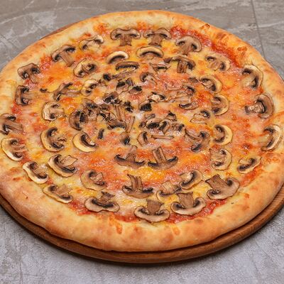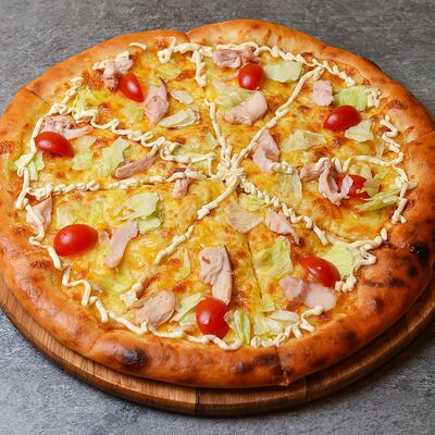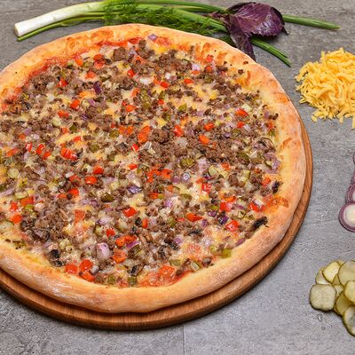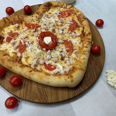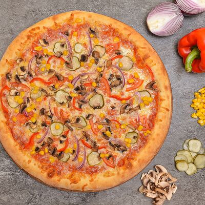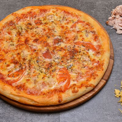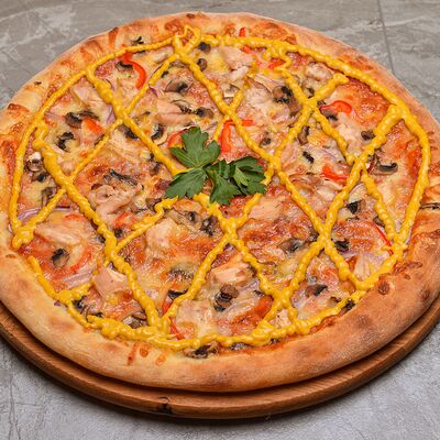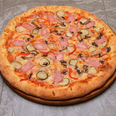 Соус барбекю, куриная ветчина, красный лук, маринованный огурец, грибы шампиньоны, перец болгарский, сыр российский, моцарелла