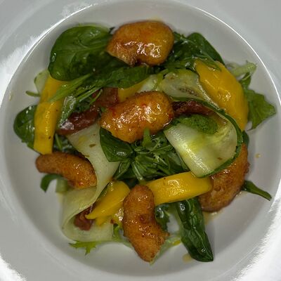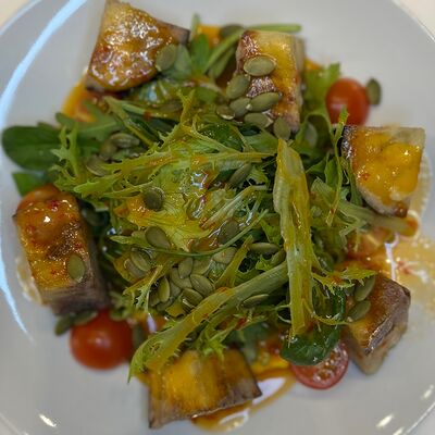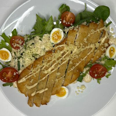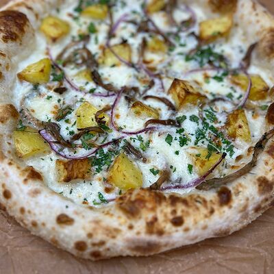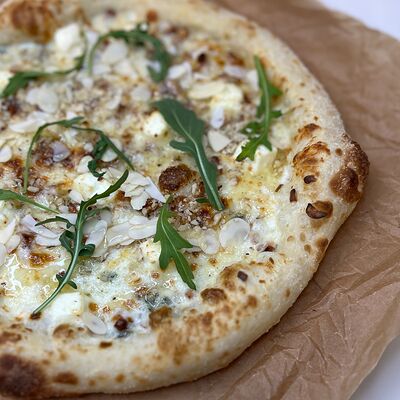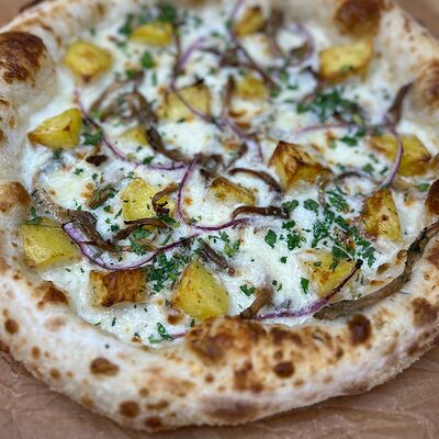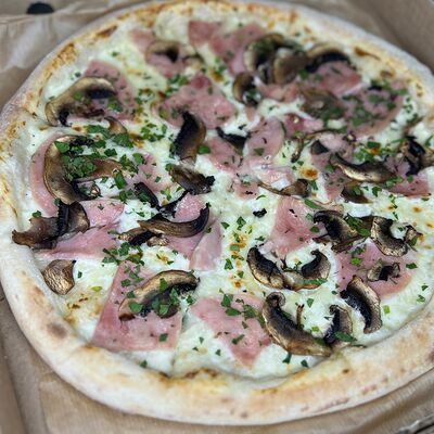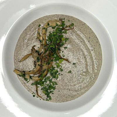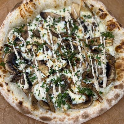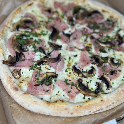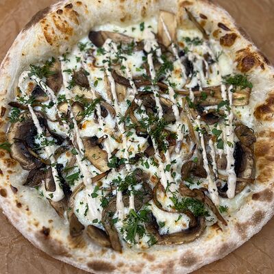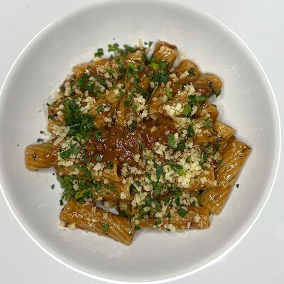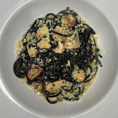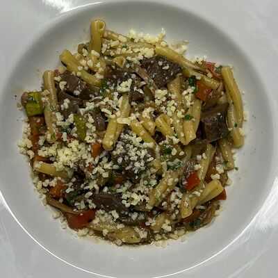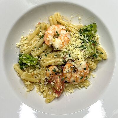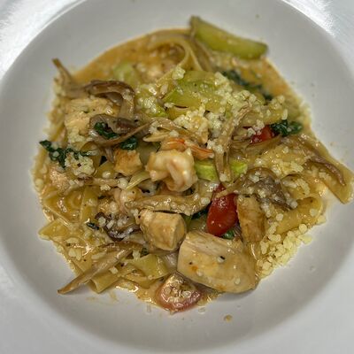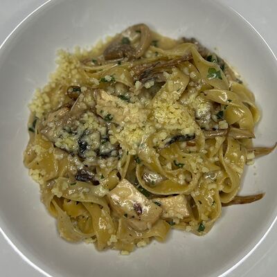 Паста, лук, масло чесночное, масло сливочное, куриное филе, шампиньоны, вешенки, вино белое, паста трюфельная, соус сырный, зелень