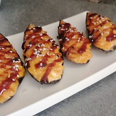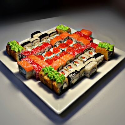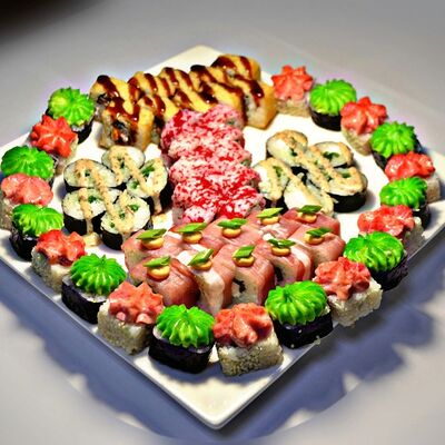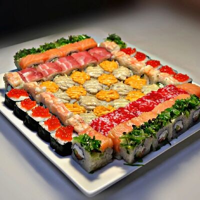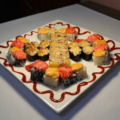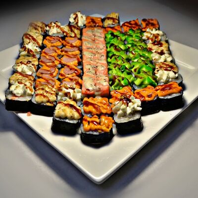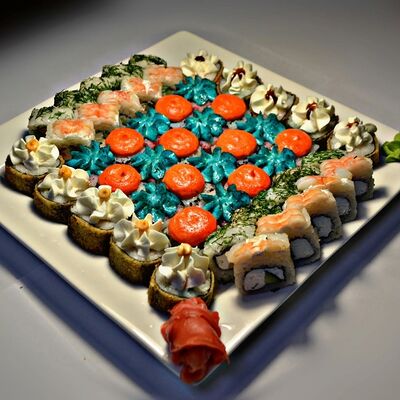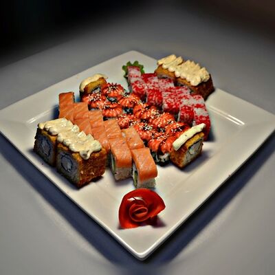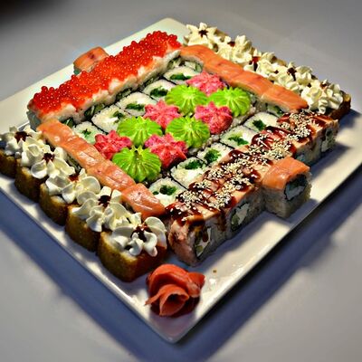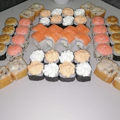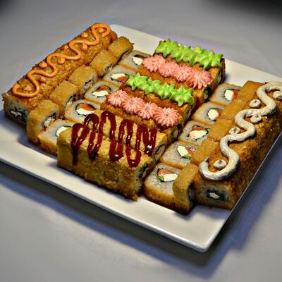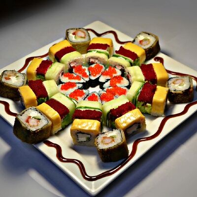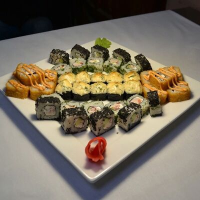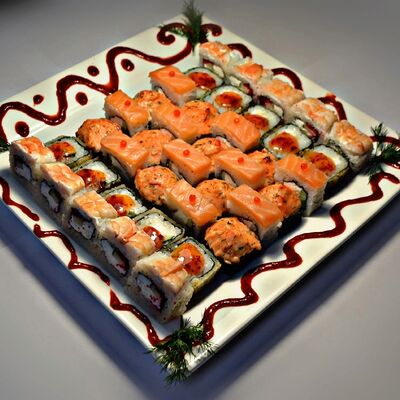 Филадельфия, Классика с окунем, Классика с огурцом, Темпура с омлетом и морским окунем, политый ореховым соусом, Запечённый с омлетом и чукой, Запечённый с курицей (48 шт.)
