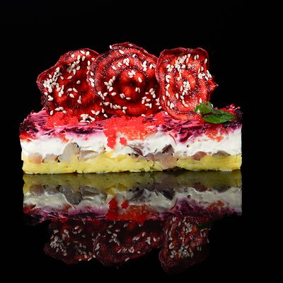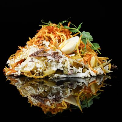 Семга слабого посола, огурец свежий, горошек консервированный, морковь, картофель отварной, майонез