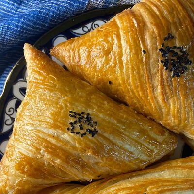 Песочное тесто, говяжий фарш, картошка, лук, специи, соль
