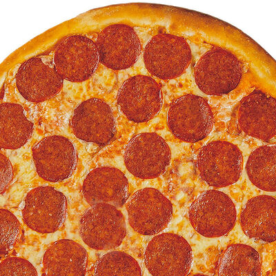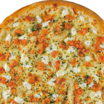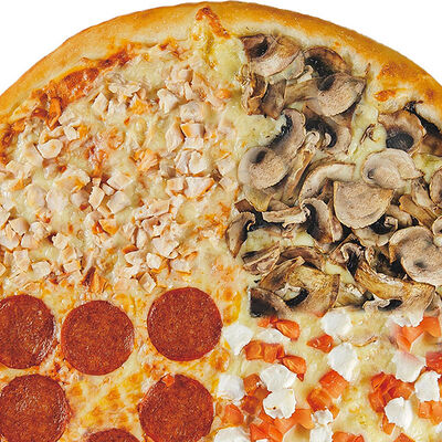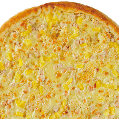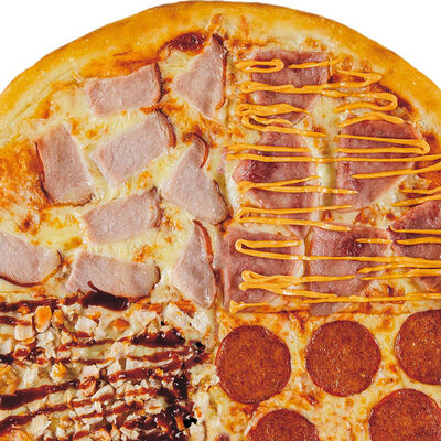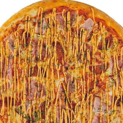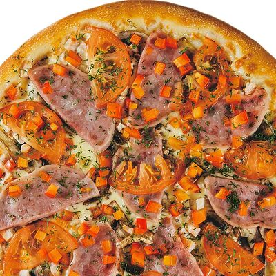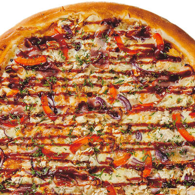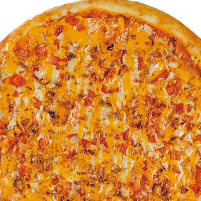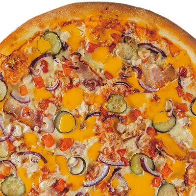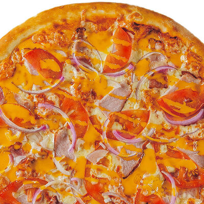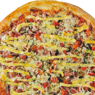 Фирменное тесто, сыр моцарелла, соус цезарь, грудка куриная копченая, шампиньоны, пепперони, томаты, сыр творожный, орегано (30 см)