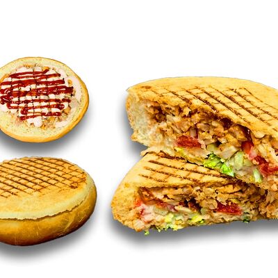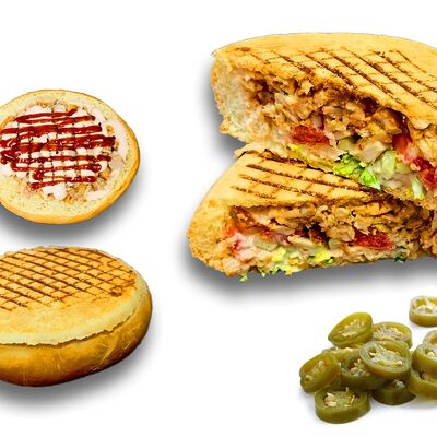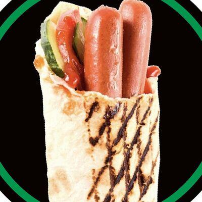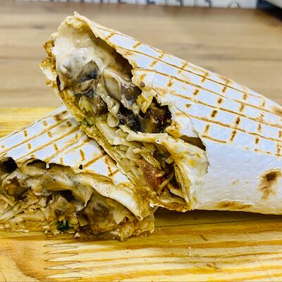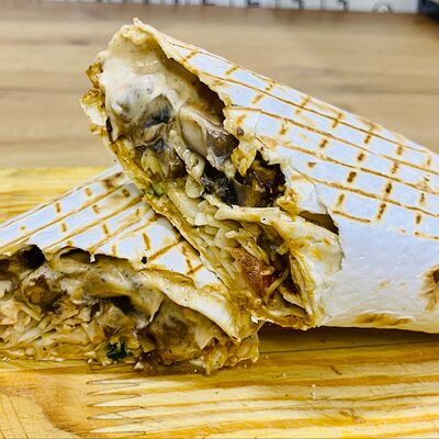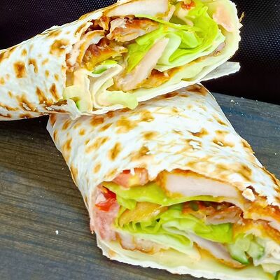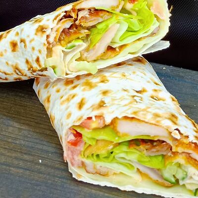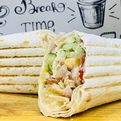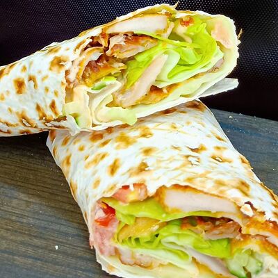 Лаваш тонкий, курица, огурцы, помидоры, капуста, соус белый чесночный и перец халапеньо