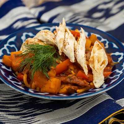 Смесь овощей, приготовленных на открытом огне в казане