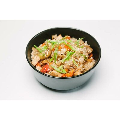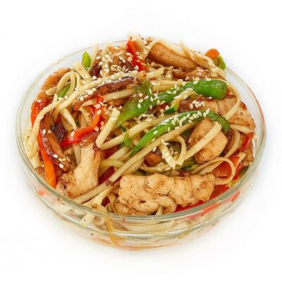 Филе говядины, обжаренное в соусе терияки, лапша гречневая, овощи и ароматный кунжут