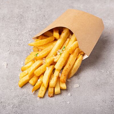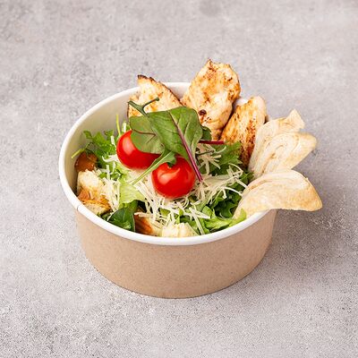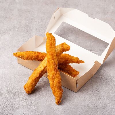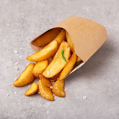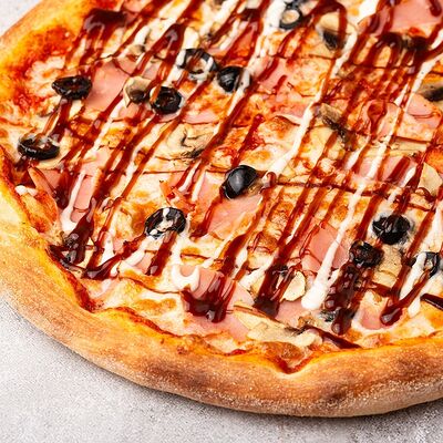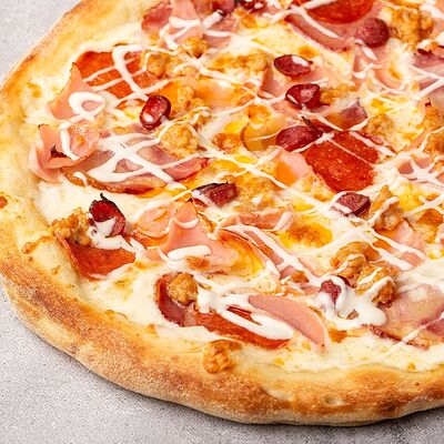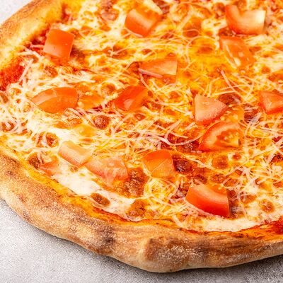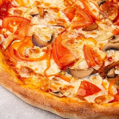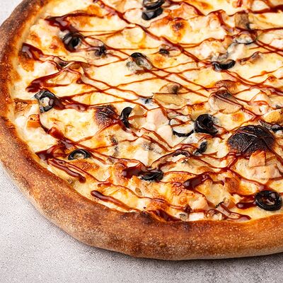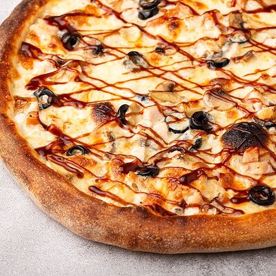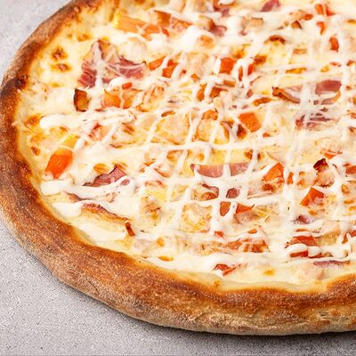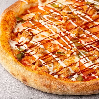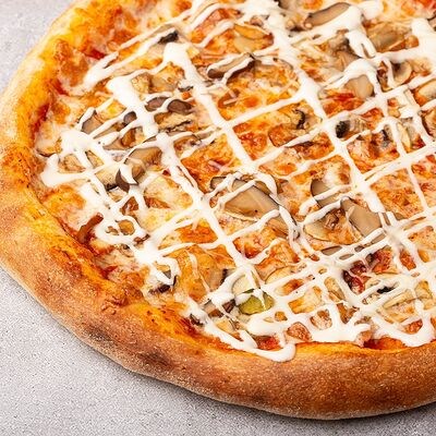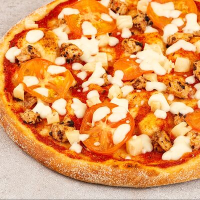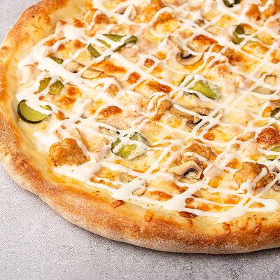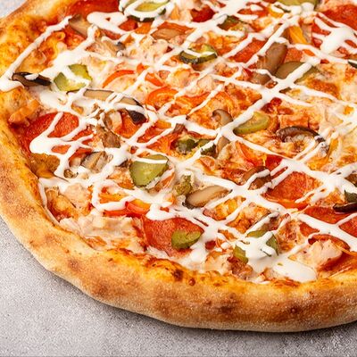 Сыр моцарелла, свежие томаты, соленый огурчик, сыр чеддер, куриное филе, картофель фри, фирменный соус, чесночное масло (30 см)