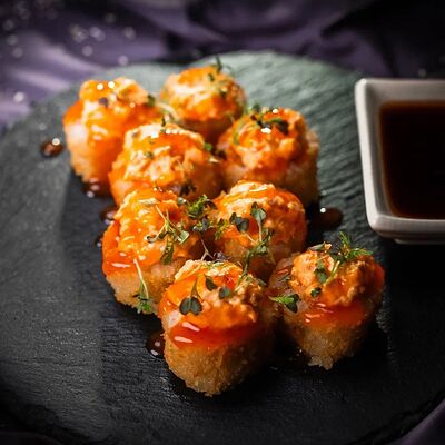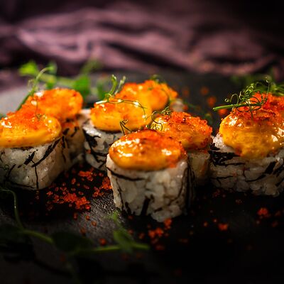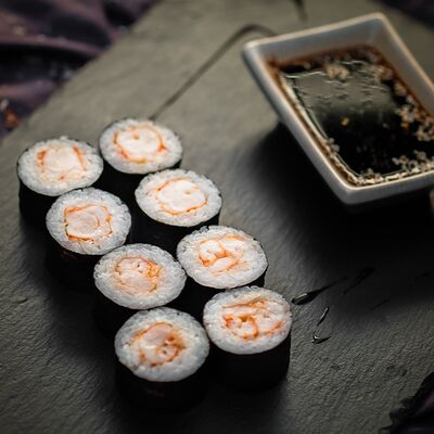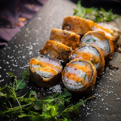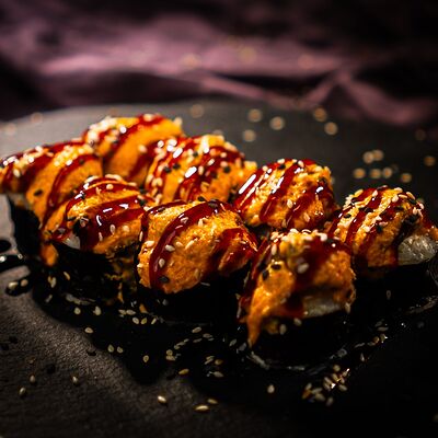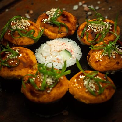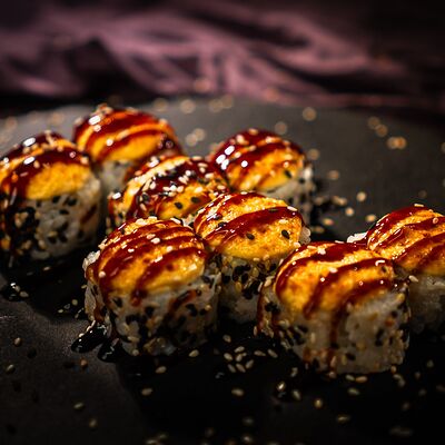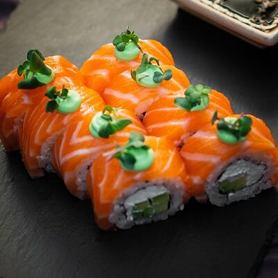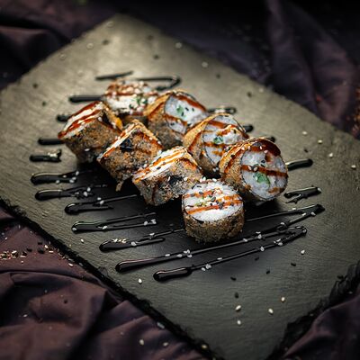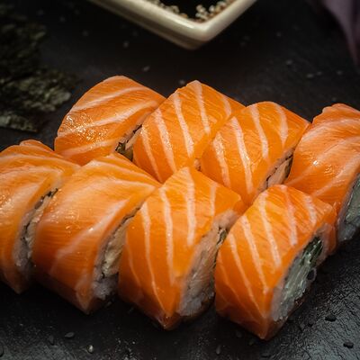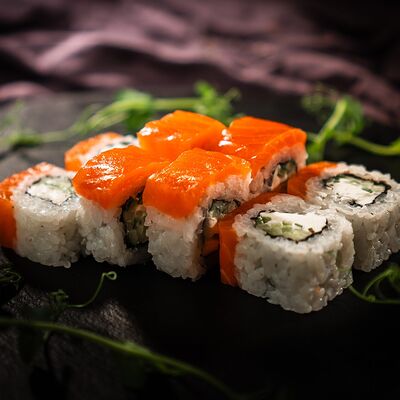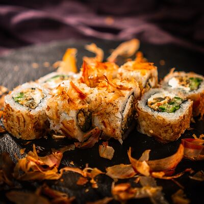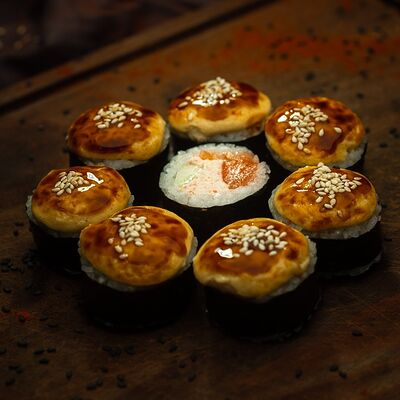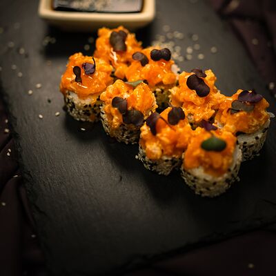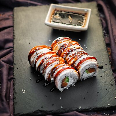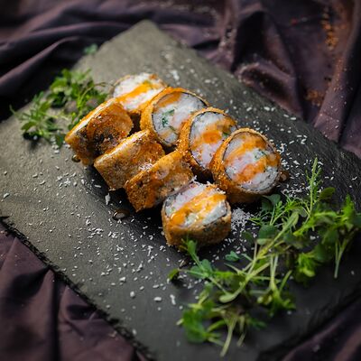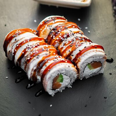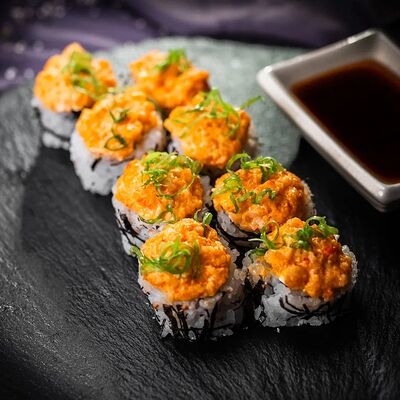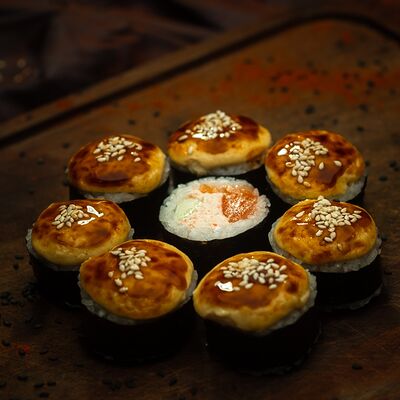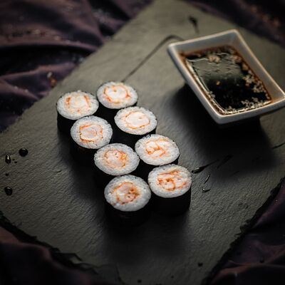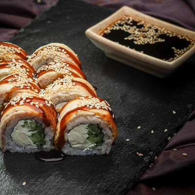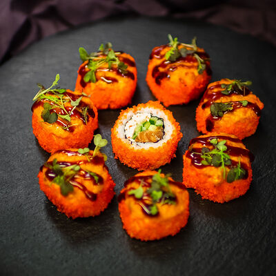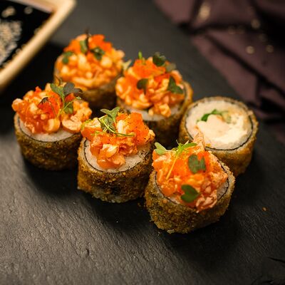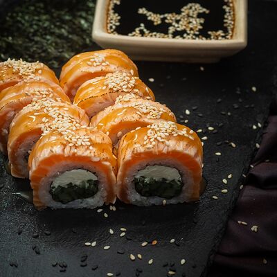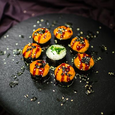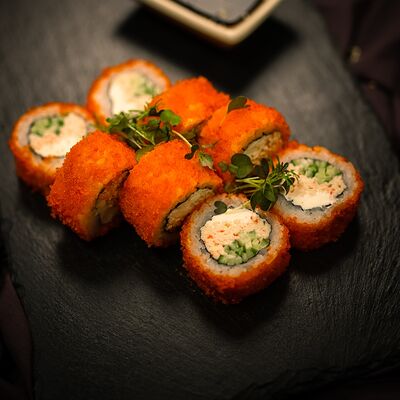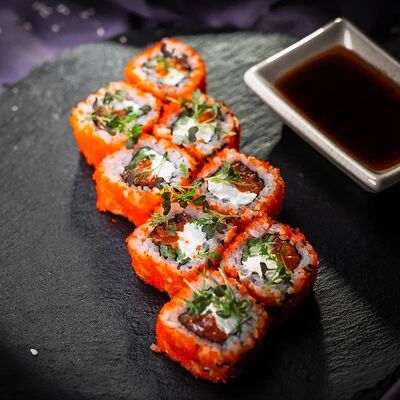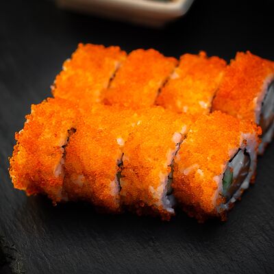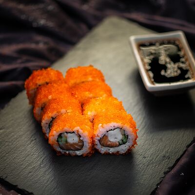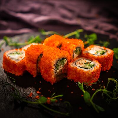 Рис, творожный сыр, огурец, крем-краб, икра масаго, нори. Шапочка: майонез, икра тобико. Соевый соус, имбирь, васаби продаются отдельно