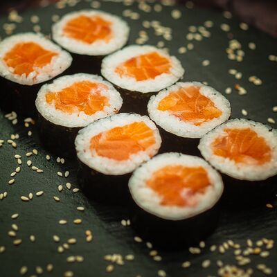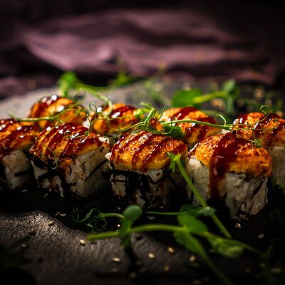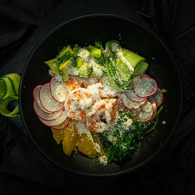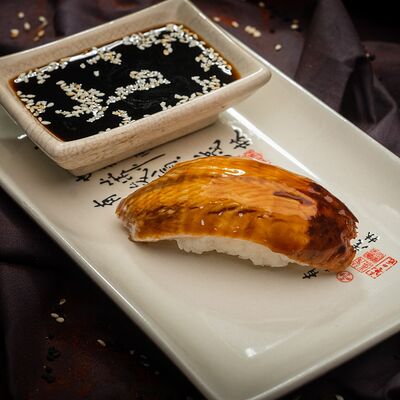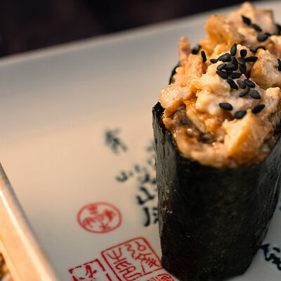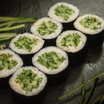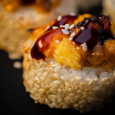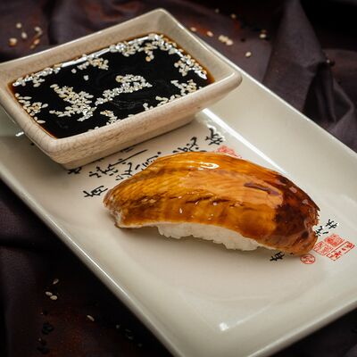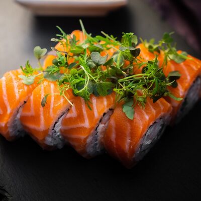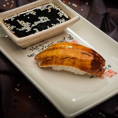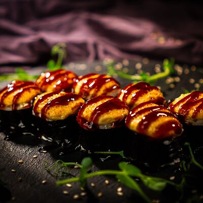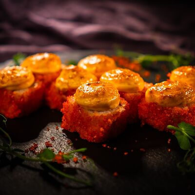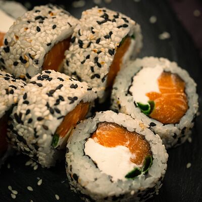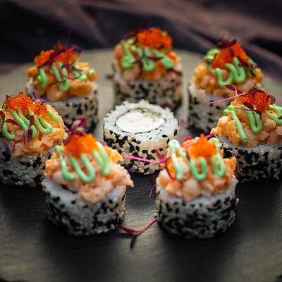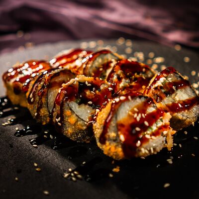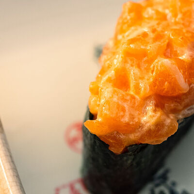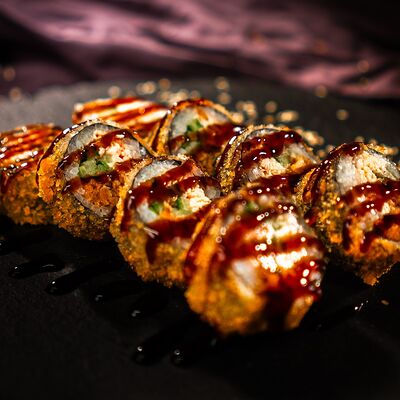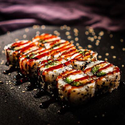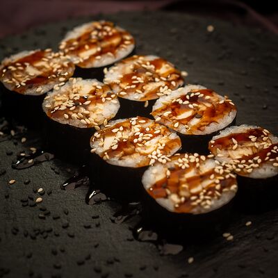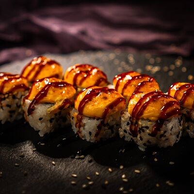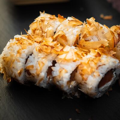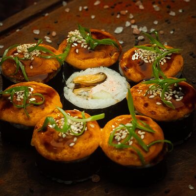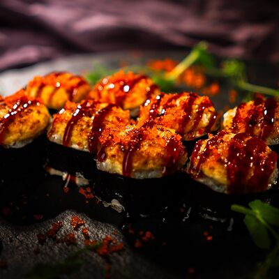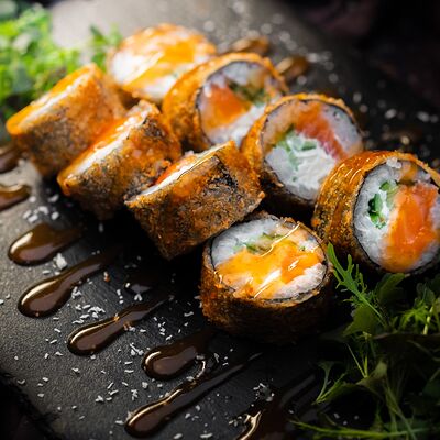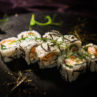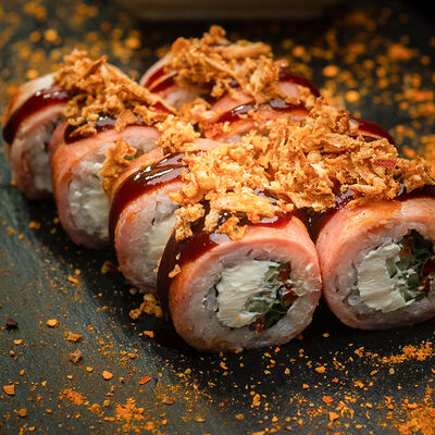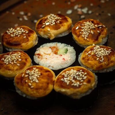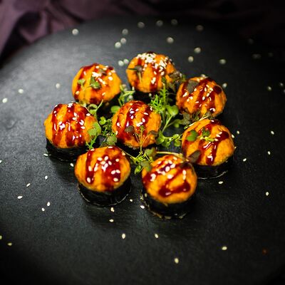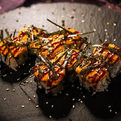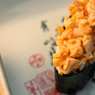 Рис, творожный сыр, огурец, крем-краб, икра масаго, нори. Шапочка: майонез, икра тобико. Соевый соус, имбирь, васаби продаются отдельно