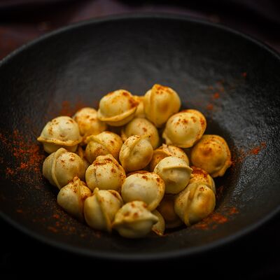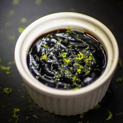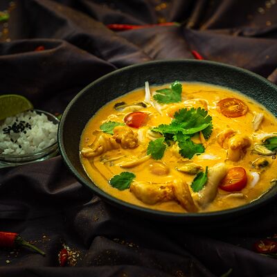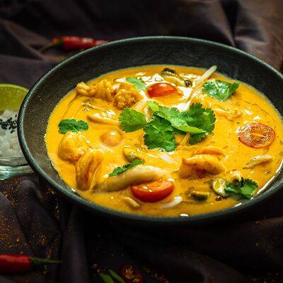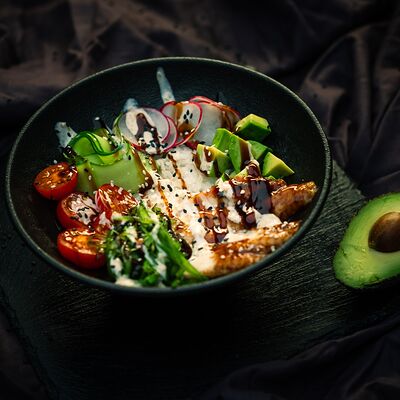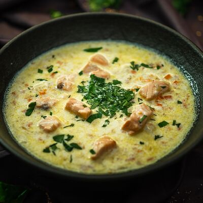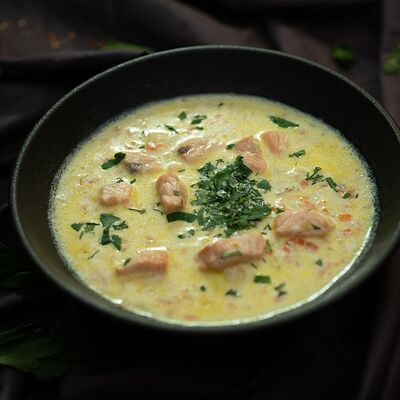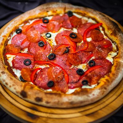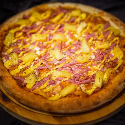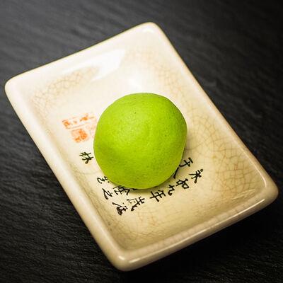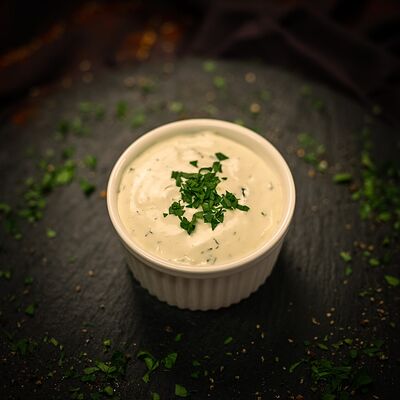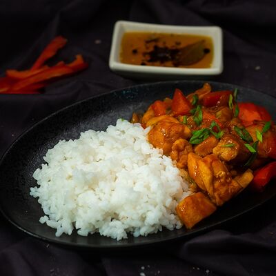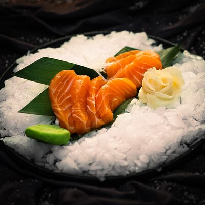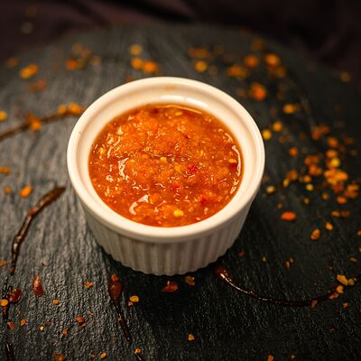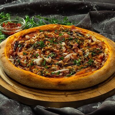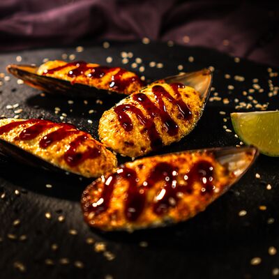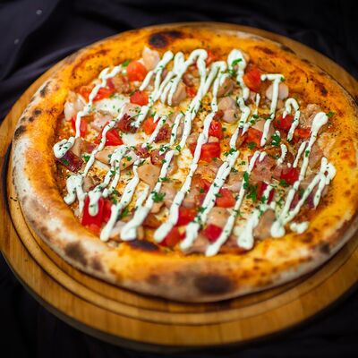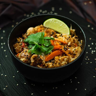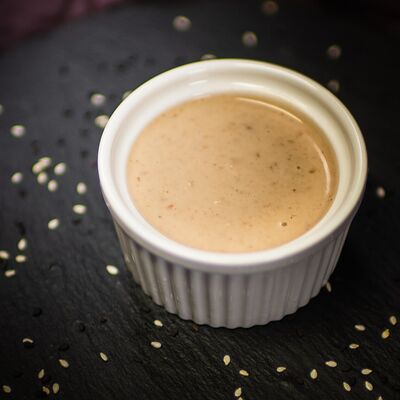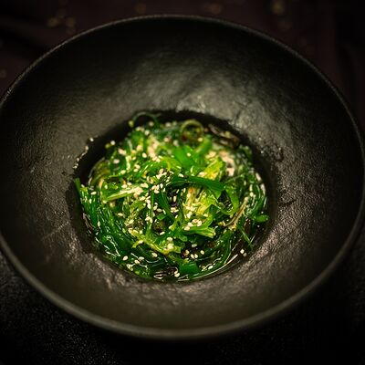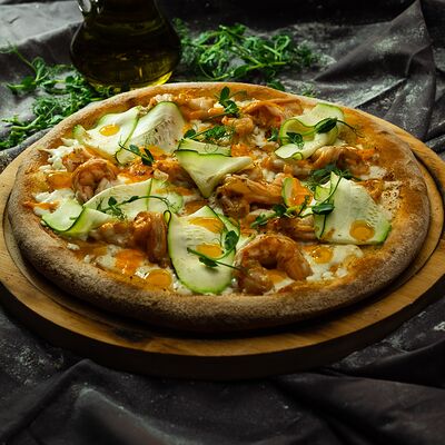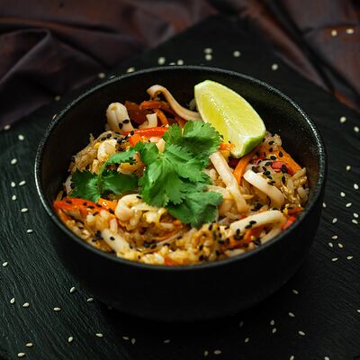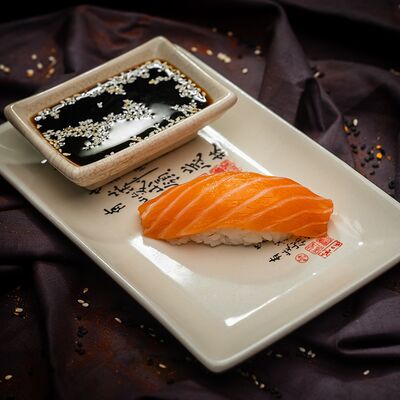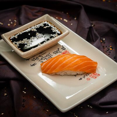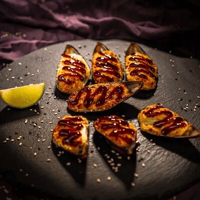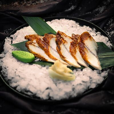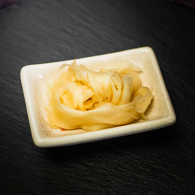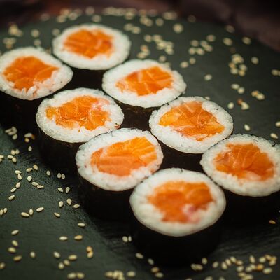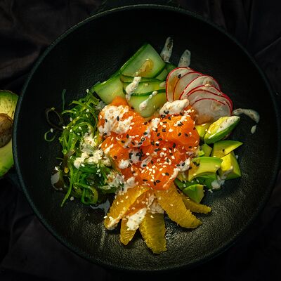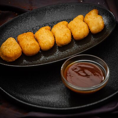 Рис, творожный сыр, огурец, крем-краб, икра масаго, нори. Шапочка: майонез, икра тобико. Соевый соус, имбирь, васаби продаются отдельно