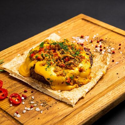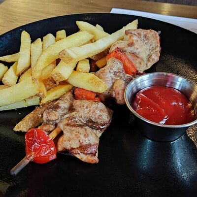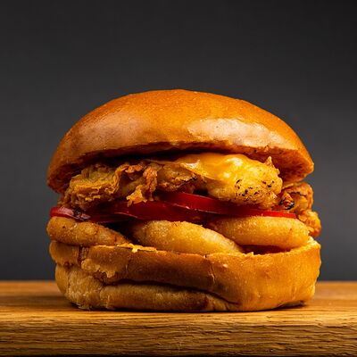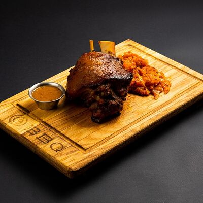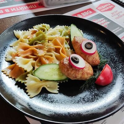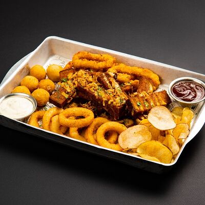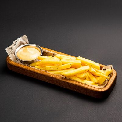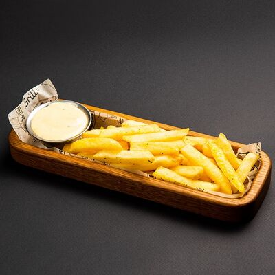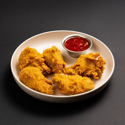 Куриные крылья, соус барбекю, петрушка, лук фри
