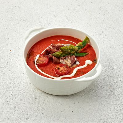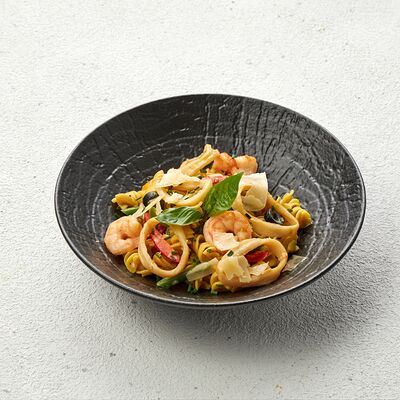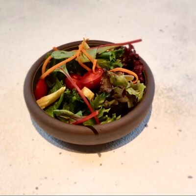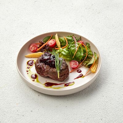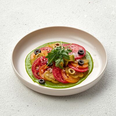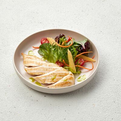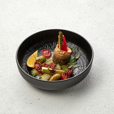 Со спаржей, карамелизированной грушей, свежими томатами, мини-кукурузой, фермерской зеленью и рукколой