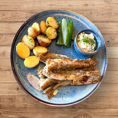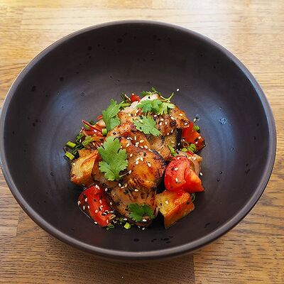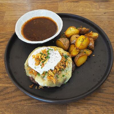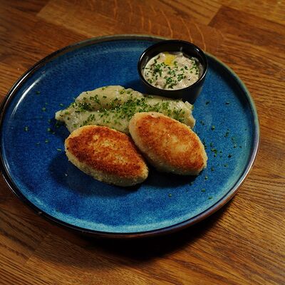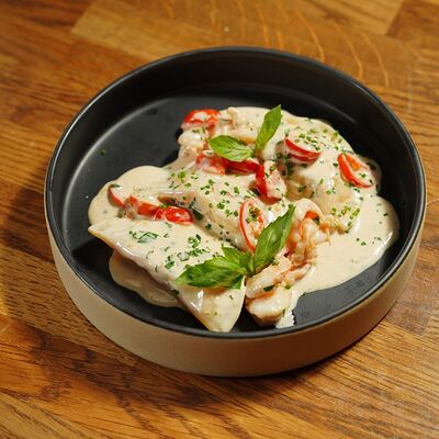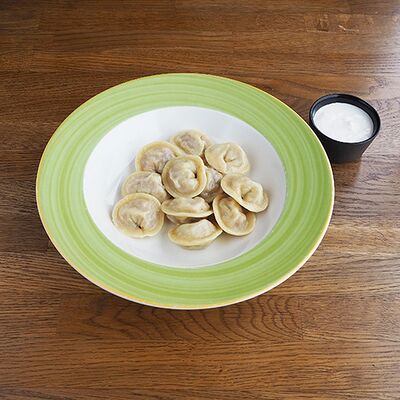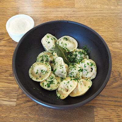 Свинина, говядина, тесто для пельменей, масло сливочное, специи, зелень. Подаются со сметаной