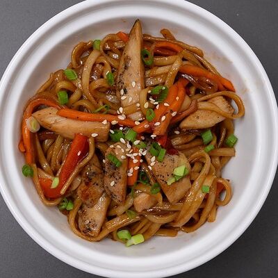 Свинина (филе), морковь, перец сладкий, лук, шампиньоны, терияки соус, кунжут. Лапша на выбор