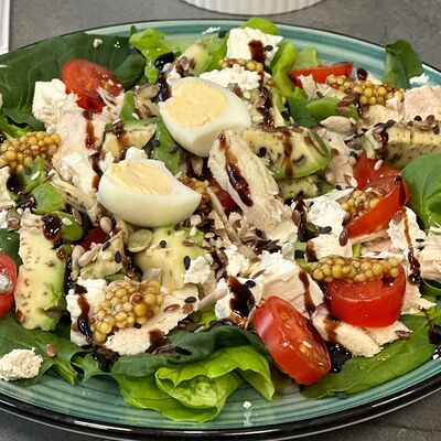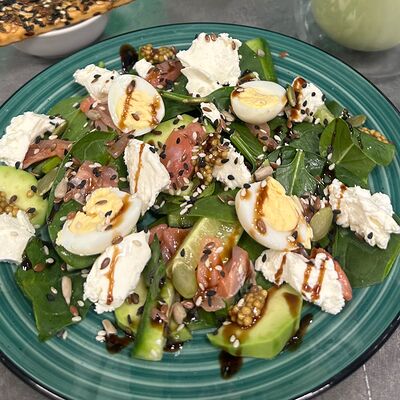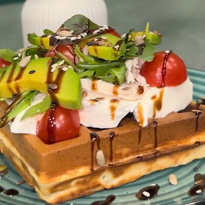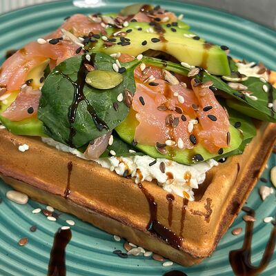 Вафли с слабосоленой рыбой ( форель ), сыром Филадельфия, огурцом, зеленью и авокадо. Сверху украшено соусом и смесью полезных семян