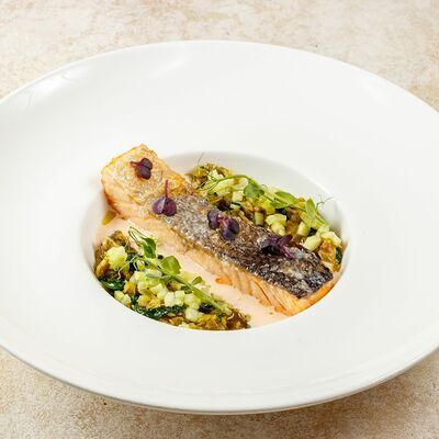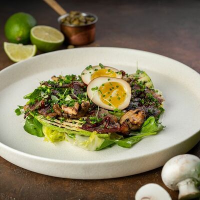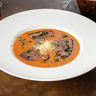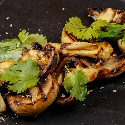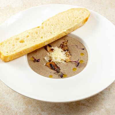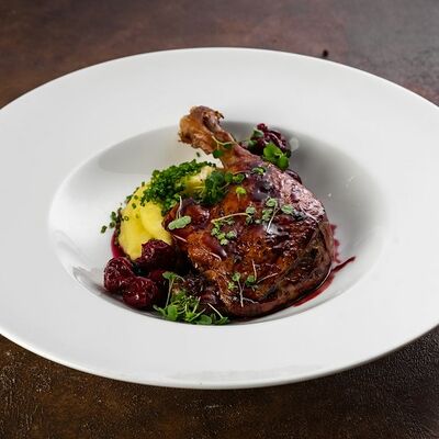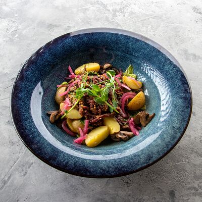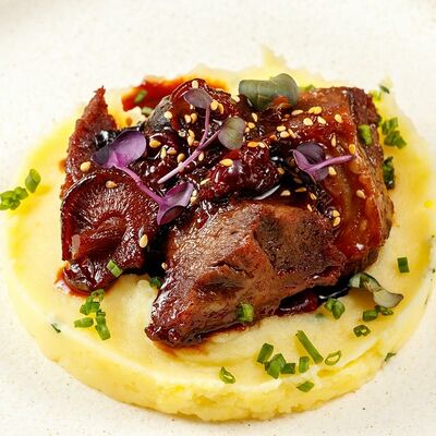 Телятина, грибы белые, вешенки, лук репчатый, масло растительное, соевый соус, сметана, сливки, бульон сухой грибной, смесь пяти перцев, помидоры черри, картофельное пюре, шпинат, укроп, петрушка (зеленая пыль), шпинат, масло трюфельное, сыр Грана падано