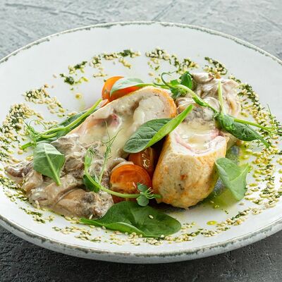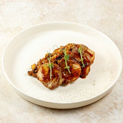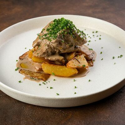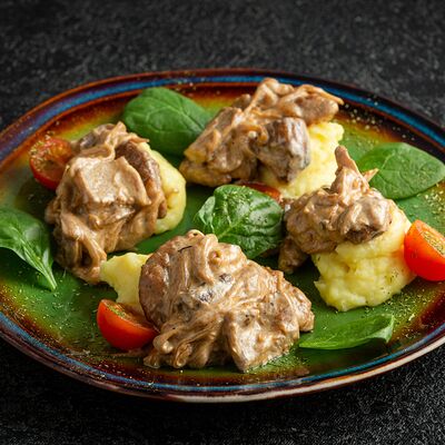Телятина в соусе из белых грибов и вешенок с картофельным пюре доставка