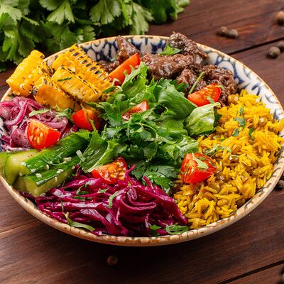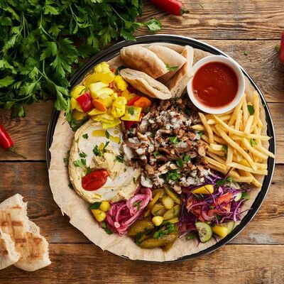 Пита, желтый фалафель, капуста сайд, томат, маринованные огурцы, копчено-томатный перец, соус манго-сливочный, соус амба-чили, сумах