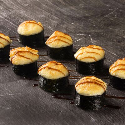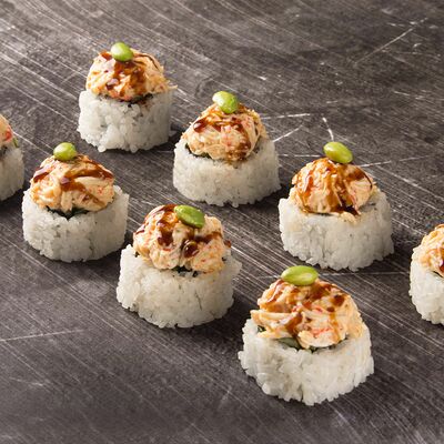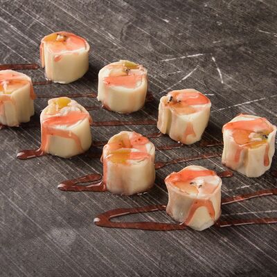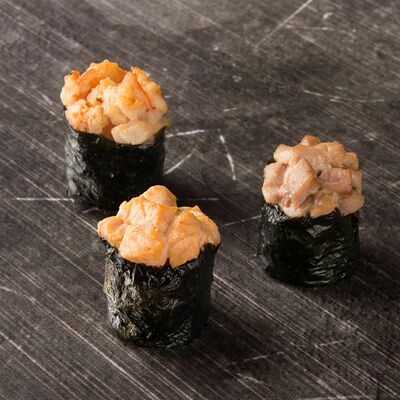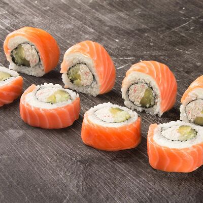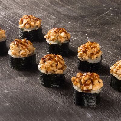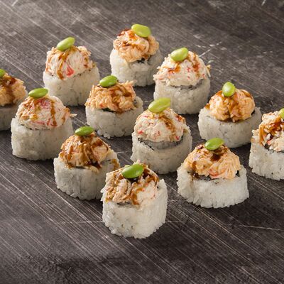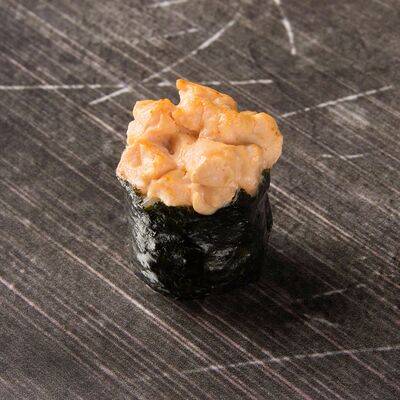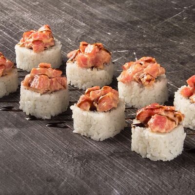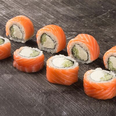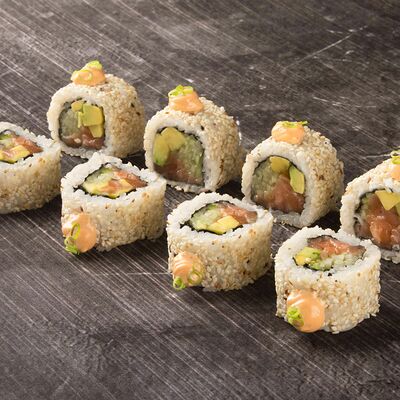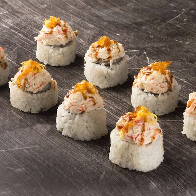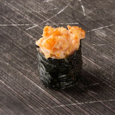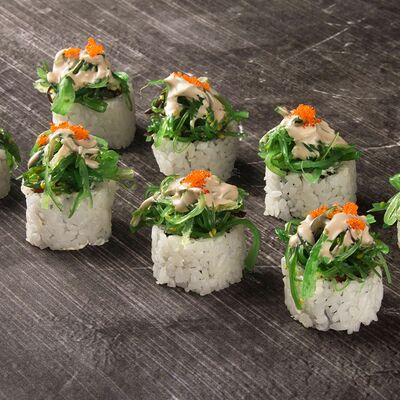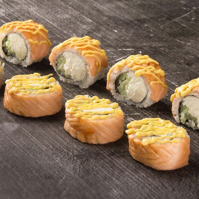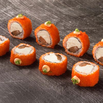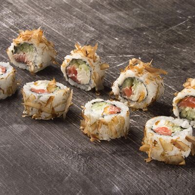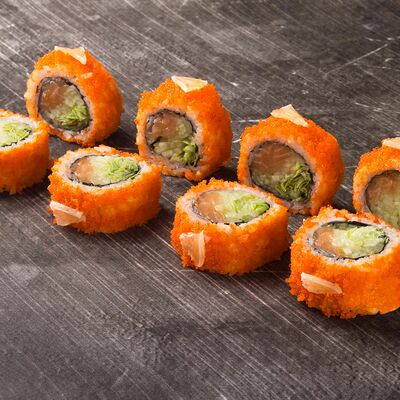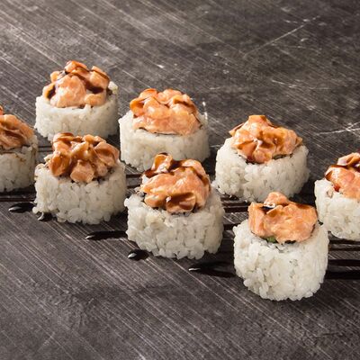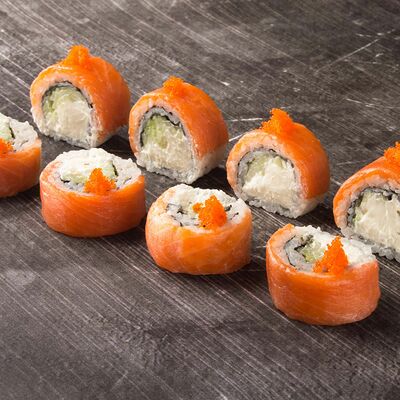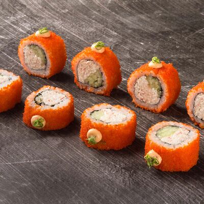 Лосось, сливочный сыр, икра тобико, икра масаго, спайси-соус, лук зеленый, рис