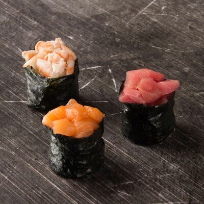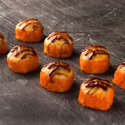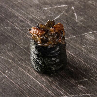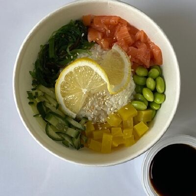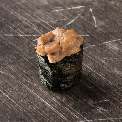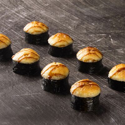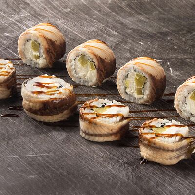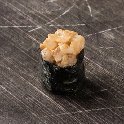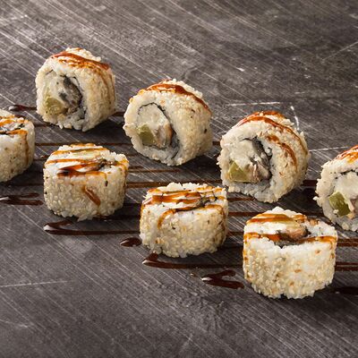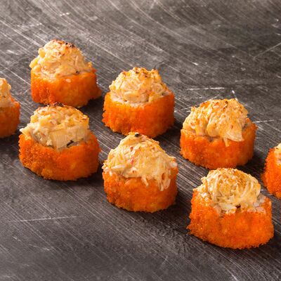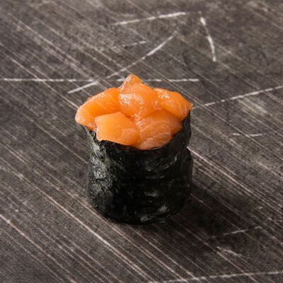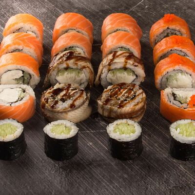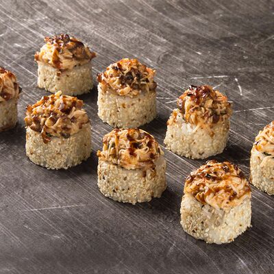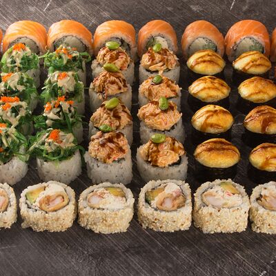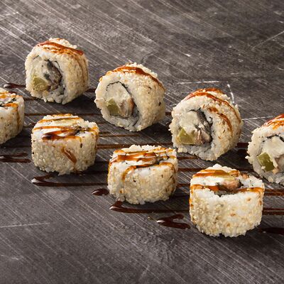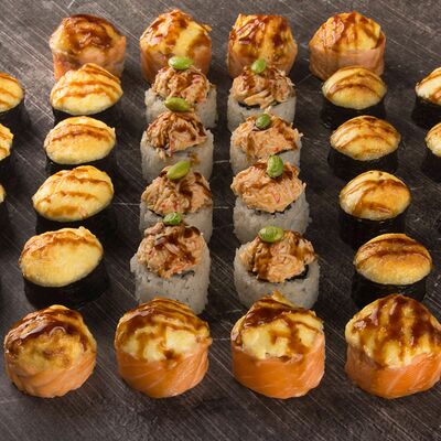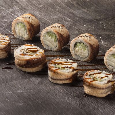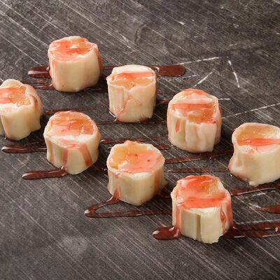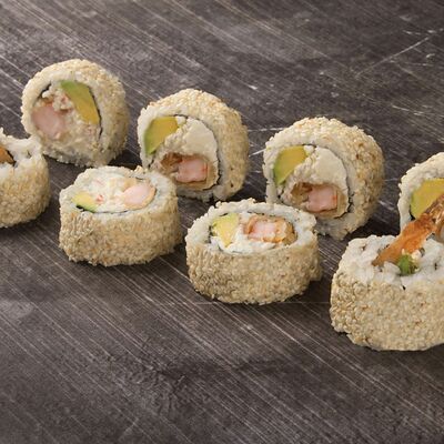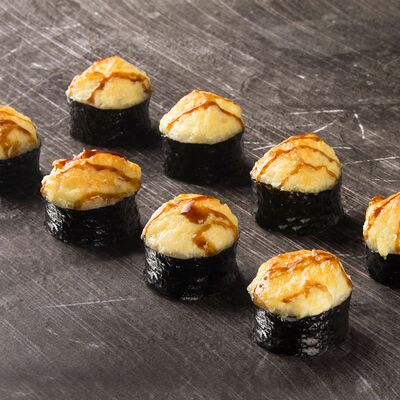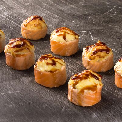 Лосось, сливочный сыр, икра тобико, икра масаго, спайси-соус, лук зеленый, рис