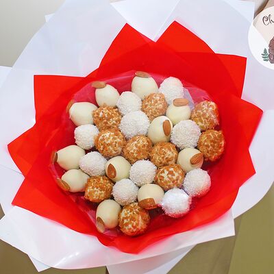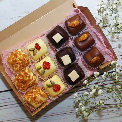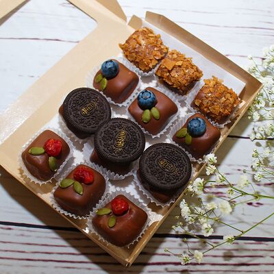 Маршмеллоу (12 шт.), белый, молочный и темный бельгийский шоколад, вафельная крошка, миндаль, вяленая вишня, тыквенные семечки, кубики кокоса