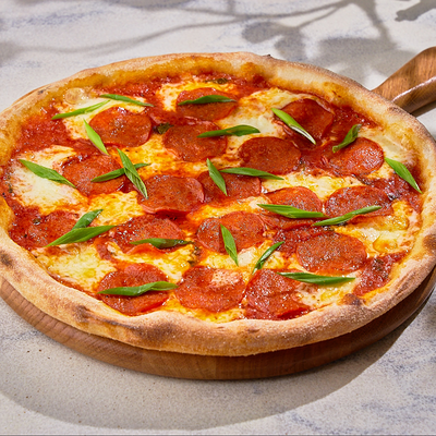 Тесто для пиццы (мука из твердых сортов, вода, оливковое масло, соль), соус для пиццы (томаты в собственном соку, соль, специи), сыр моцарелла, салями острая (30 см)